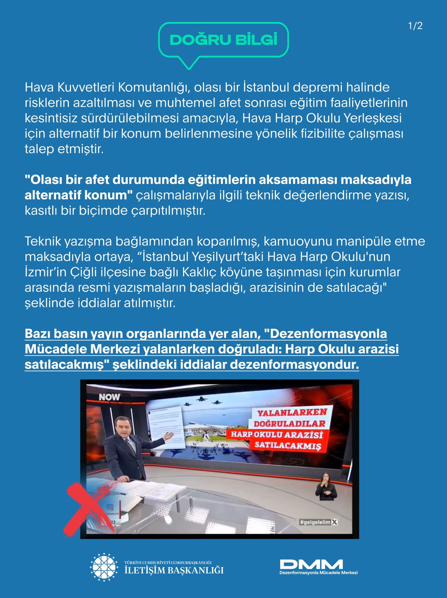 DMM’nin sosyal medya hesabından yapılan paylaşımda, “Bazı basın yayın organlarında yer alan, ‘Dezenformasyonla Mücadele Merkezi yalanlarken doğruladı: Harp Okulu arazisi satılacakmış’ şeklindeki iddialar dezenformasyondur. Hava Kuvvetleri Komutanlığı, olası bir İstanbul depremi halinde risklerin azaltılması ve muhtemel afet sonrası eğitim faaliyetlerinin kesintisiz sürdürülebilmesi amacıyla, Hava Harp Okulu Yerleşkesi için alternatif bir konum belirlenmesine yönelik fizibilite çalışması talep etmiştir. ‘Olası bir afet durumunda eğitimlerin aksamaması maksadıyla alternatif konum’ çalışmalarıyla ilgili teknik değerlendirme yazısı, kasıtlı bir biçimde çarpıtılmıştır. Teknik yazışma bağlamından koparılmış, kamuoyunu manipüle etme maksadıyla ortaya, ‘İstanbul Yeşilyurt’taki Hava Harp Okulunun İzmir’in Çiğli ilçesine bağlı Kaklıç köyüne taşınması için kurumlar arasında resmi yazışmaların başladığı, arazisinin de satılacağı’ şeklinde iddialar atılmıştır. Bahse konu iddialar Merkezimiz tarafından yalanlanmış, teknik bir yazışmanın bağlamından koparıldığı açıkça ifade edilmiştir. Merkezimizin iddialara ilişkin açıklamasında, ‘Hava Harp Okulu’nun taşınmasına yönelik alınmış bir karar bulunmadığı’ vurgulanmıştır. Hava Harp Okulu Yerleşkesinde deprem riski de göz önünde bulundurularak başlatılan güçlendirme ve iskan amaçlı kapasite artırım çalışmalarının devam ettiği belirtilmiştir. Bu açıklamanın da teknik yazışmalar gibi çarpıtılıp servis edildiği tespit edilmiştir. Hava Harp Okulu’nun taşınmasına, dolayısıyla arazinin boşaltılıp satılmasına yönelik bir karar veya çalışma bulunmamaktadır” denildi.