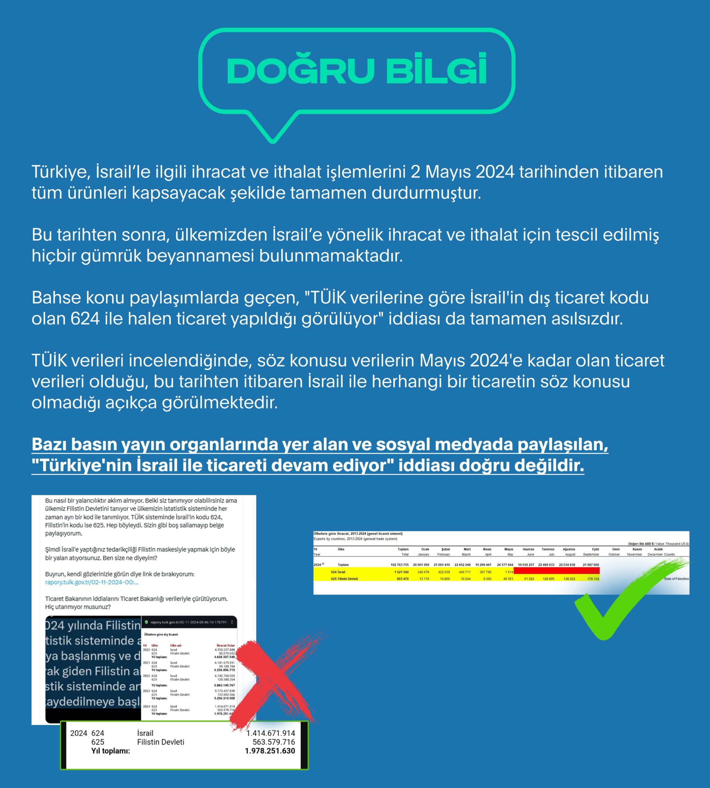 “Bu tarihten sonra, ülkemizden İsrail’e yönelik ihracat ve ithalat için tescil edilmiş hiçbir gümrük beyannamesi bulunmamaktadır. Bahse konu paylaşımlarda geçen, “TÜİK verilerine göre İsrailin dış ticaret kodu olan 624 ile halen ticaret yapıldığı görülüyor” iddiası da tamamen asılsızdır. TÜİK verileri incelendiğinde, söz konusu verilerin Mayıs 2024e kadar olan ticaret verileri olduğu, bu tarihten itibaren İsrail ile herhangi bir ticaretin söz konusu olmadığı açıkça görülmektedir.”