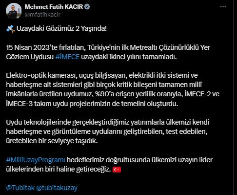 Sanayi ve Teknoloji Bakanı Mehmet Fatih Kacır, sosyal medya hesabından yaptığı paylaşımda, “Uzaydaki gözümüz 2 yaşında. 15 Nisan 2023te fırlatılan, Türkiyenin ilk metre altı çözünürlüklü yer gözlem uydusu İMECE, uzaydaki ikinci yılını tamamladı. Elektro-optik kamerası, uçuş bilgisayarı, elektrikli itki sistemi ve haberleşme alt sistemleri gibi birçok kritik bileşeni tamamen milli imkanlarla üretilen uydumuz, yüzde 90a erişen yerlilik oranıyla, İMECE-2 ve İMECE-3 takım uydu projelerimizin de temelini oluşturdu. Uydu teknolojilerinde gerçekleştirdiğimiz yatırımlarla ülkemizi kendi haberleşme ve görüntüleme uydularını geliştirebilen, test edebilen, üretebilen bir seviyeye taşıdık. Milli Uzay Programı hedeflerimiz doğrultusunda ülkemizi uzayın lider ülkelerinden biri haline getireceğiz” ifadelerini kullandı.