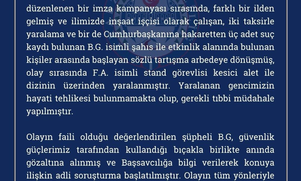 “Bugün saat 14.30 sıralarında ilimiz Ortahisar ilçesi Maraş Caddesinde meydana gelen olayla ilgili olarak kamuoyunu bilgilendirme ihtiyacı doğmuştur. Cumhuriyet Halk Partisi (CHP) İl Gençlik Kolları tarafından düzenlenen bir imza kampanyası sırasında, farklı bir ilden gelmiş ve ilimizde inşaat işçisi olarak çalışan, iki taksirle yaralama ve bir de cumhurbaşkanına hakaretten üç adet suç kaydı bulunan B.G. isimli şahıs ile etkinlik alanında bulunan kişiler arasında başlayan sözlü tartışma arbedeye dönüşmüş, olay sırasında F.A. isimli stant görevlisi kesici alet ile dizinin üzerinden yaralanmıştır. Yaralanan gencimizin hayati tehlikesi bulunmamakta olup, gerekli tıbbi müdahale yapılmıştır. Olayın faili olduğu değerlendirilen şüpheli B.G, güvenlik güçlerimiz tarafından kullandığı bıçakla birlikte anında gözaltına alınmış ve Başsavcılığa bilgi verilerek konuya ilişkin adli soruşturma başlatılmıştır. Olayın tüm yönleriyle aydınlatılması için Emniyet birimlerimiz ve ilgili makamlar titizlikle çalışmaktadır. Trabzon Valiliği olarak, her türlü provokatif eyleme karşı vatandaşlarımızı sağduyuya davet ediyoruz, Kentimizde huzur ve güvenliğin korunması adına tüm tedbirler alınmıştır.”