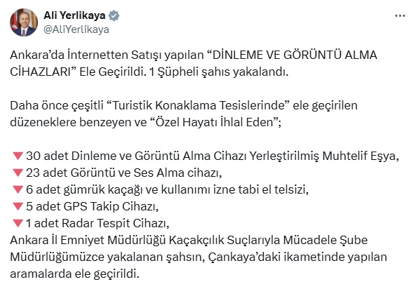 Bakan Yerlikaya, sosyal medya hesabından yaptığı açıklamada, internetten dinleme ve görüntü alma cihazları satan şüphelinin Çankaya ilçesinde yakalandığını belirtti. Yerlikaya, şüphelinin evinde yapılan aramada; daha önce çeşitli turistik konaklama tesislerinde ele geçirilen düzeneklere benzeyen ve özel hayatı ihlal eden; 30 dinleme ve görüntü alma cihazı yerleştirilmiş eşya, 23 görüntü ve ses alma cihazı, 6 gümrük kaçağı ve kullanımı izne tabi el telsizi, 5 GPS takip cihazı, 1 radar tespit cihazı ele geçirildiğini ifade etti.