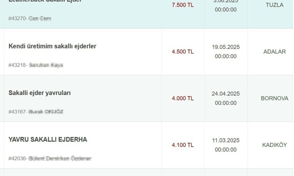 “Canlılar gayet sağlıklı ve kendi üretimimdir. İştahları yerindedir”, “Takas düşünülür”, “Yavru +47 cm gaint sakallı ejder erkek iletişim WhatsApp”, “2 yaşında dişi sağlıklı red hypo sakallı ejder.”