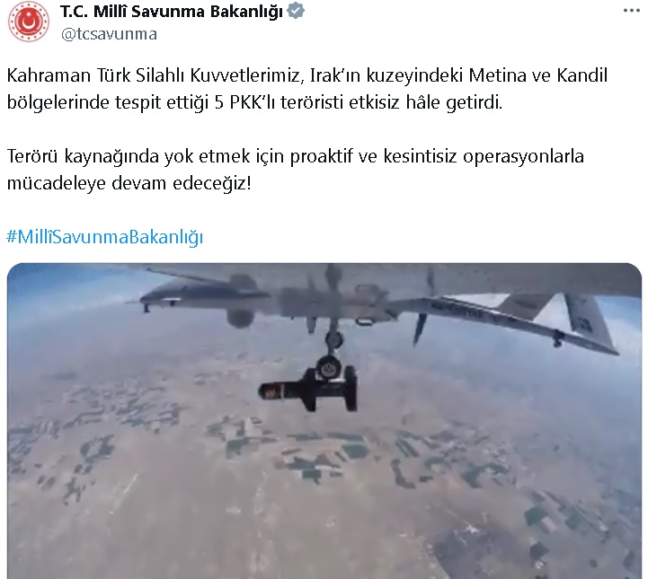 MSBnin sosyal medya hesabı üzerinden yapılan açıklamada, “Kahraman Türk Silahlı Kuvvetlerimiz, Irak’ın kuzeyindeki Metina ve Kandil bölgelerinde tespit ettiği 5 PKK’lı teröristi etkisiz hale getirdi. Terörü kaynağında yok etmek için proaktif ve kesintisiz operasyonlarla mücadeleye devam edeceğiz” denildi.