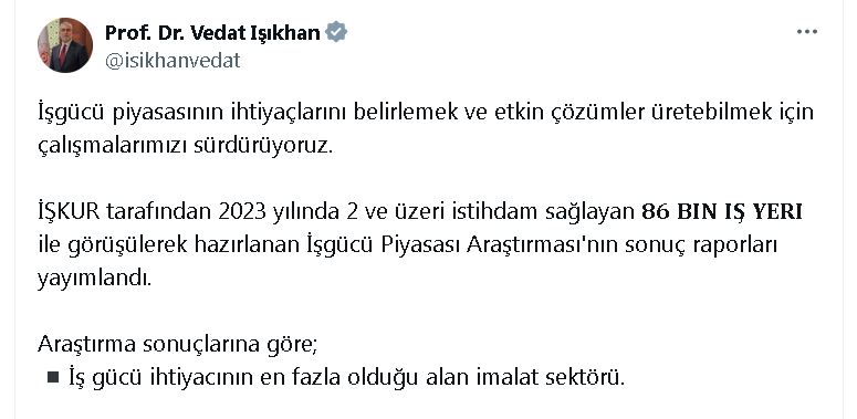 ÇALIŞMA ve Sosyal Güvenlik Bakanı Vedat Işıkhan, Türkiye İş Kurumunun (İŞKUR) İşgücü Piyasası Araştırması sonuçlarına göre; iş gücü ihtiyacının en fazla olduğu alanın imalat sektörü olduğunu açıkladı.Bakan Işıkhan, sosyal medya hesabından yaptığı açıklamada, “İş gücü piyasasının ihtiyaçlarını belirlemek ve etkin çözümler üretebilmek için çalışmalarımızı sürdürüyoruz. İŞKUR tarafından 2023 yılında 2 ve üzeri istihdam sağlayan 86 bin iş yeri ile görüşülerek hazırlanan İşgücü Piyasası Araştırmasının sonuç raporları yayımlandı. Araştırma sonuçlarına göre; iş gücü ihtiyacının en fazla olduğu alan imalat sektörü. İşverenlerden alınan geri bildirimlere göre gelecek 10 yılda ön plana çıkması beklenen meslekler ise yazılım mühendisi, e-ticaret uzmanı, yapay zeka uzmanı, bilişim uzmanı, inşaat mühendisi, pazarlama uzmanı, dil ve konuşma terapisti ve CNC operatörü” ifadelerini kullandı. EN ÇOK ARANAN MESLEKLERİŞKURun yayımladığı İşgücü Piyasası Araştırması raporlarına göre; imalat sektöründe yer alan iş yerlerinin yüzde 16,6sında eleman ihtiyacı bulunurken, aynı sektörde 20 ve üzeri çalışanı olan iş yerlerinin ise yüzde 37,3ünde eleman ihtiyacı olduğu belirlendi. İşverenler tarafından en fazla eleman aranan meslekler; makineci (dikiş), garson (servis elemanı), satış danışmanı, ahşap mobilya imalat ustası, temizlik görevlisi, gazaltı kaynakçısı, konfeksiyon işçisi, akaryakıt satış elemanı, ark kaynakçısı ve şoför (yük taşıma) oldu. Açık iş olan mesleklerde aranan beceriler incelendiğinde yeterli mesleki ve teknik bilginin ilk sırada, iş tecrübesinin ikinci sırada olduğu tespit edildi.