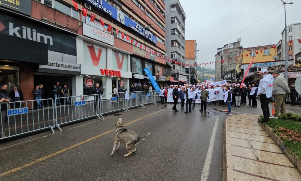 Bu arada Zonguldak Belediyesine ait dron, mitingi görüntülemek için alçak uçuş yaptığı sırada bir sokak köpeği dronu yakalamak için defalarca havaya sıçradı. Köpeğin dron ile girdiği mücadele görenleri gülümsetti.