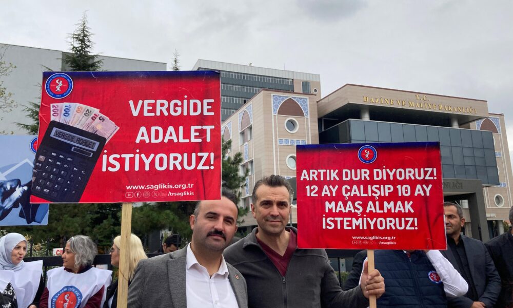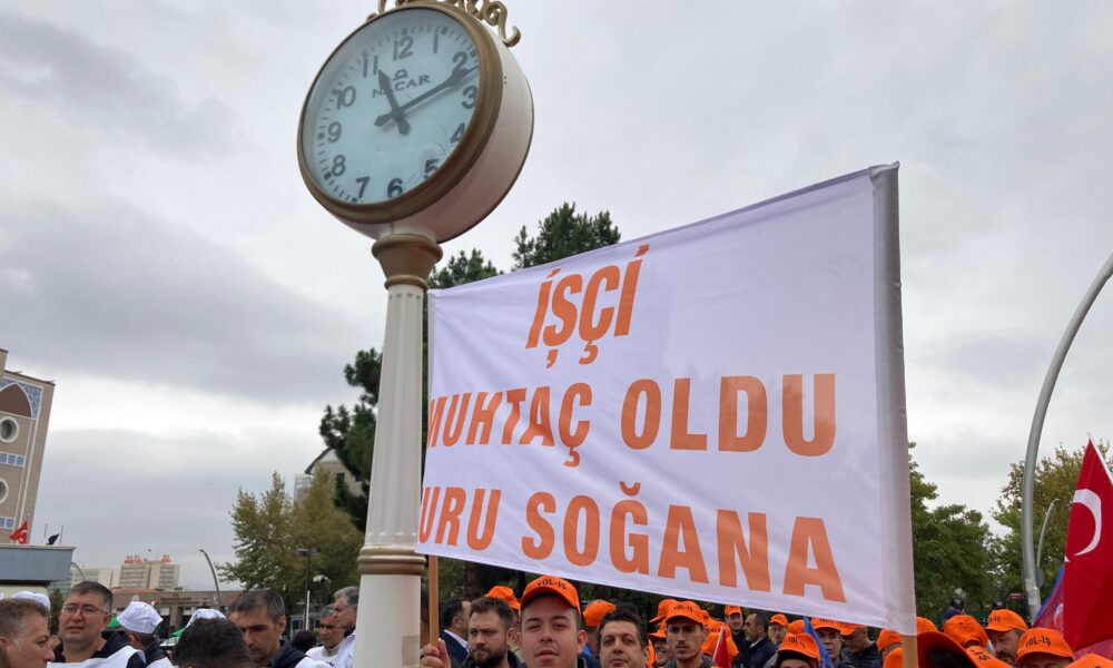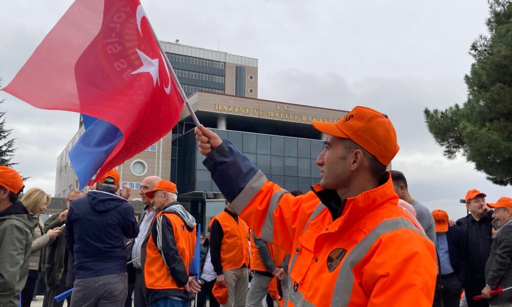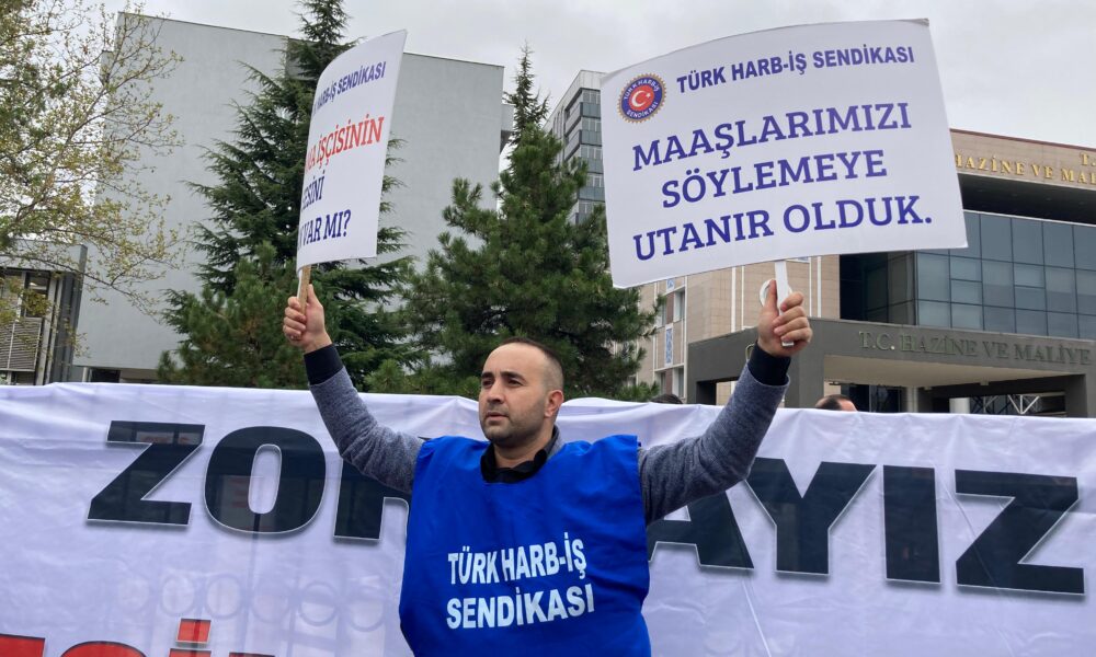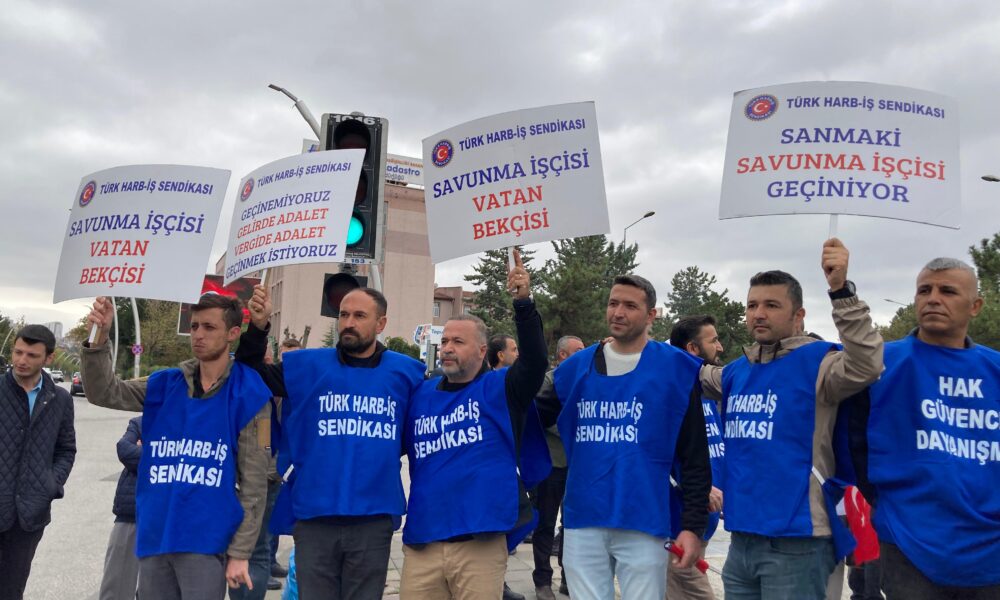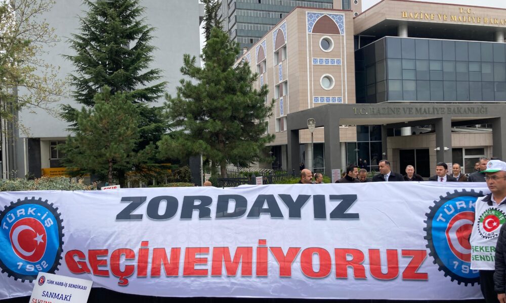Türk-İş Başkanlar Kurulunun dün yapılan toplantısında hayat pahalılığı, satın alma gücündeki gerileme, vergi adaletsizliği, ücret dengesizliği, işsizlik, kayıt dışı istihdam, emeklilik şartları gibi konular ele alındı. Toplantıda, uygulanan iktisat programı ve vergi adaletsizliği konularına yönelik Hazine ve Maliye Bakanlığı önünde basın açıklaması yapılması kararlaştırıldı. Bugün Türk-İş öncülüğünde çeşitli sektörlerden işçi sendikalarına üye işçiler bakanlık önünde bir araya geldi. Grup, bakanlığın kapısına Zordayız geçinemiyoruz yazılı pankart astı. Ayrıca, İşçi muhtaç oldu kuru soğana, Savunma işçisinin sesini duyan var mı, Vergide adalet istiyoruz ve Maaşlarımızı söylemeye utanır olduk yazılı pankart ve dövizler taşıyan sendika üyeleri, çeşitli sloganlar attı.