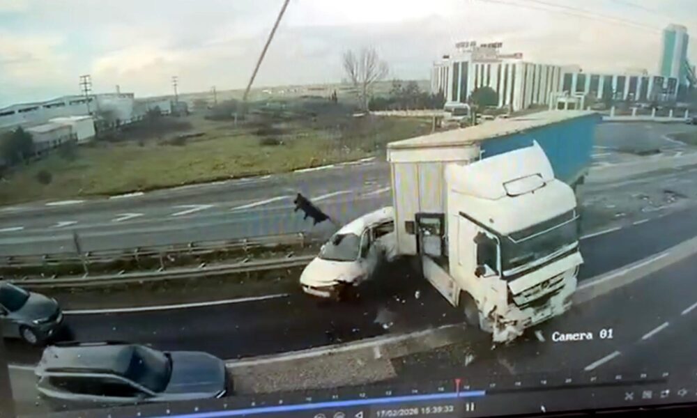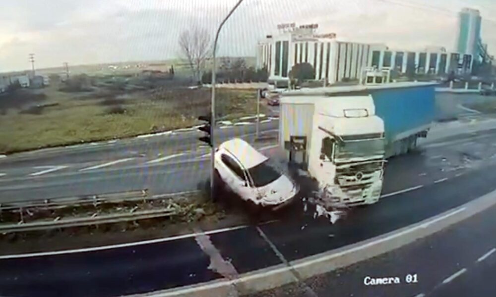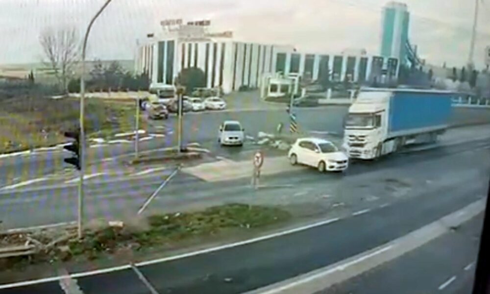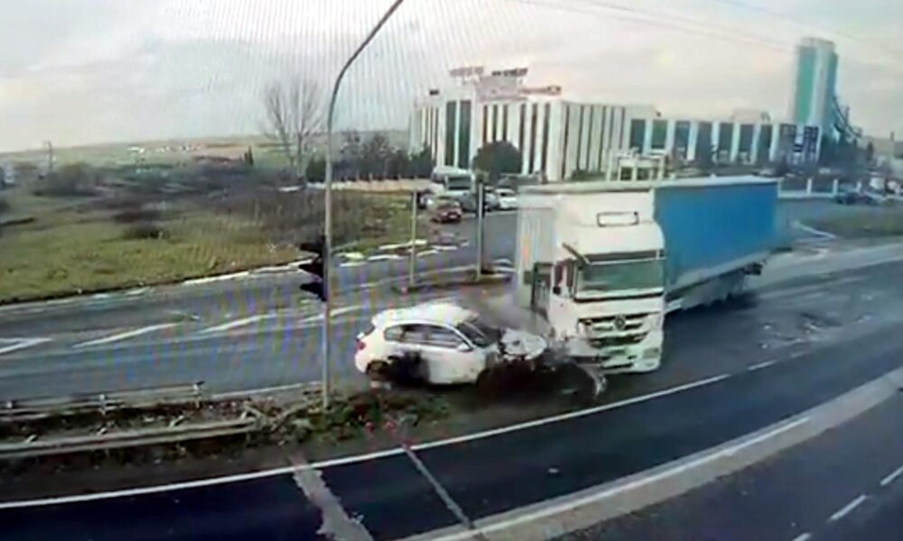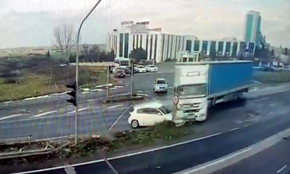 Işık ihlali yapan TIR’ın çarptığı otomobilin sürücüsü yaralandı; kaza kamerada