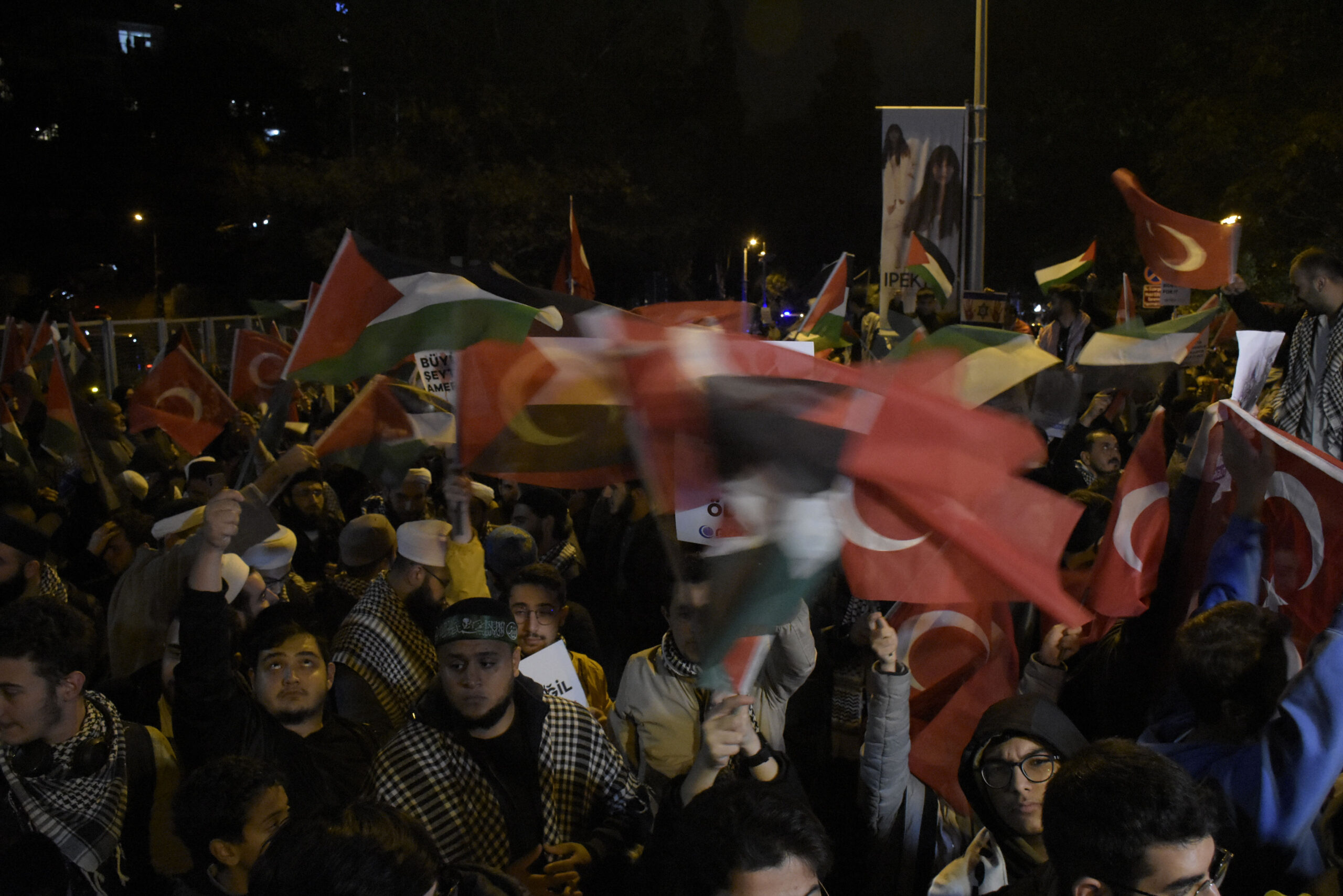 AGD İstanbul Şubesi üyesi bir grup, İsrail’in Gazze’ye yönelik saldırılarının destekleyicisi olduğu iddiasıyla ABD’nin İstanbul Başkonsolosluğu önünde protesto eylemi gerçekleştirdi. Polisin yoğun güvenlik önlemleri altında saat 21.30’tan itibaren toplanmaya başlayan grup üyeleri İsrail ve ABD aleyhine sloganlar attı. Ellerinde Filistin Bayrağı ve döviz taşıyan göstericiler sık sık tekbir getirerek “İstanbul’dan Gazze’ye direnişe bin selam”, “İsrail hastaneleri bombalıyor, parasını Biden ödüyor”, “Katil Biden Kudüs’ten defol”, “Siyonist elçilik kapatılsın”, “Katil İsrail, işbirlikçi ABD”, “Büyük şeytan ABD”, “Oluk oluk kan aksa, kurtulacak El Aksa”, “Cenk, cihat, şehadet”, “Mehmetçik Gazze’ye” diye slogan attı.