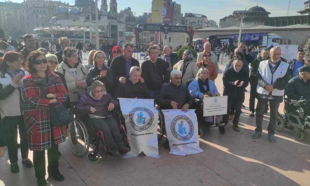 Türkiye Sakatlar Derneği üyesi bir grup, sabah saatlerinde Taksim Meydanı’nda bir araya geldi. Saygı duruşu ve İstiklal Marşı’nın okunmasıyla başlayan törende, engelli bireylerin günlük yaşamda karşılaştığı sorunlar ve çözüm önerileri dile getirildi. Grup adına basın açıklaması yapan Türkiye Sakatlar Derneği Genel Başkanı Şükrü Boyraz, “3 Aralık Engelliler Haftası kapsamında, toplumun ayrılmaz bir parçası olan engelli bireylerin karşılaştığı yapısal sorunlara dikkat çekiyor ve eşit, erişilebilir, kapsayıcı bir yaşam için acil adımlar atılmasını istiyoruz. Engellilik bir eksiklik değil, toplumun çeşitliliğinin doğal bir parçasıdır. Asıl engel, toplumun gerekli düzenlemeleri yapmaması ve farkındalığın yetersiz olmasıdır. 3 Aralık Engelliler Haftası sadece farkındalık yaratmak için değil, kalıcı politikalar geliştirmek için bir çağrıdır” dedi. Basın açıklamasının ardından grup üyeleri toplu fotoğraf çektirdi.