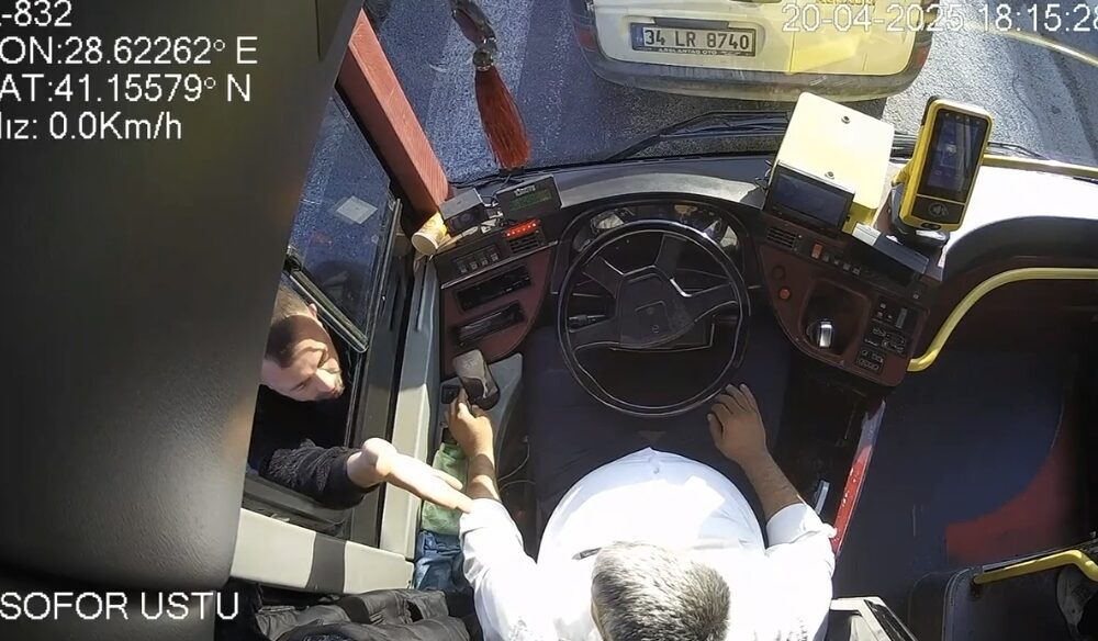 Görüntülerde, trafikte duran otobüsün arkasındaki otomobilden inen 2 kişinin otobüse doğru koştuğu, şoförle tartıştıktan sonra şüphelilerden birinin otobüsün camına vurup kırdığı anlar yer alıyor. İETT otobüsü şoförünün araçta kamera bulunduğunu ve polisi arayacağını belirtmesi, yolcuların da saldırganlara tepki göstermesi de görüntülere yansırken otobüse zarar veren 2 kişinin çevredekiler tarafından uzaklaştırıldığı görülüyor.
