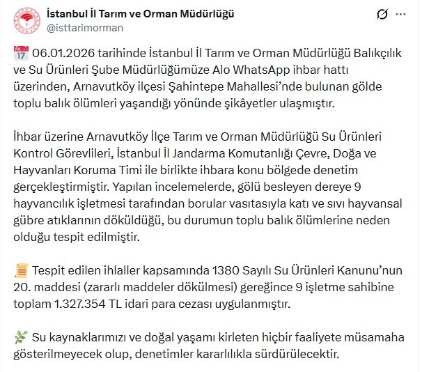 İstanbul İl Tarım ve Orman Müdürlüğü’nden yapılan açıklamada, “Balıkçılık ve Su Ürünleri Şube Müdürlüğümüze Alo WhatsApp ihbar hattı üzerinden Arnavutköy ilçesi Şirintepe Mahallesi’nde bulunan gölde toplu balık ölümleri yaşandığı yönünde şikâyetler ulaşmıştır. İhbar üzerine Arnavutköy İlçe Tarım ve Orman Müdürlüğü Su Ürünleri Kontrol Görevlileri ile İstanbul İl Jandarma Komutanlığı Çevre, Doğa ve Hayvanları Koruma Timi tarafından bölgede denetim gerçekleştirilmiştir. Yapılan incelemelerde, gölü besleyen dereye 9 hayvancılık işletmesi tarafından borular aracılığıyla katı ve sıvı hayvansal gübre atıklarının döküldüğü ve bu durumun toplu balık ölümlerine neden olduğu tespit edilmiştir. 1380 sayılı Su Ürünleri Kanunu’nun 20’nci maddesi gereğince 9 işletme sahibine toplam 1.327.354 TL idari para cezası uygulanmıştır. Su kaynaklarını ve doğal yaşamı kirleten faaliyetlere müsamaha gösterilmeyecek, denetimler kararlılıkla sürdürülecektir.” denildi.
