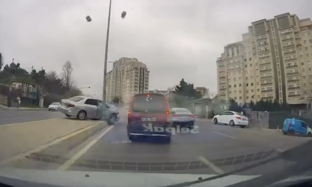 İstanbul – Ataşehir’de otomobilin çarptığı aydınlatma direği yola devrildi; kaza kamerada