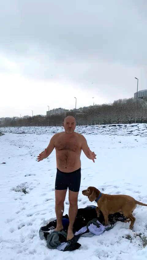 Avcılarda 36 yıldır yaşayan Bekir Şen, kar yağışının İstanbul genelinde etkisini arttırmasının ardından soğuk havaya aldırış etmeden denize girdi. Köpeği Papi ile beraber denize giren Şen, o anları çevresindeki kişilere cep telefonuyla kaydettirdi.