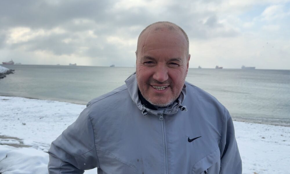 İstanbul – Avcılar’da karlı havaya aldırış etmeden köpeğiyle beraber denizde yüzdü