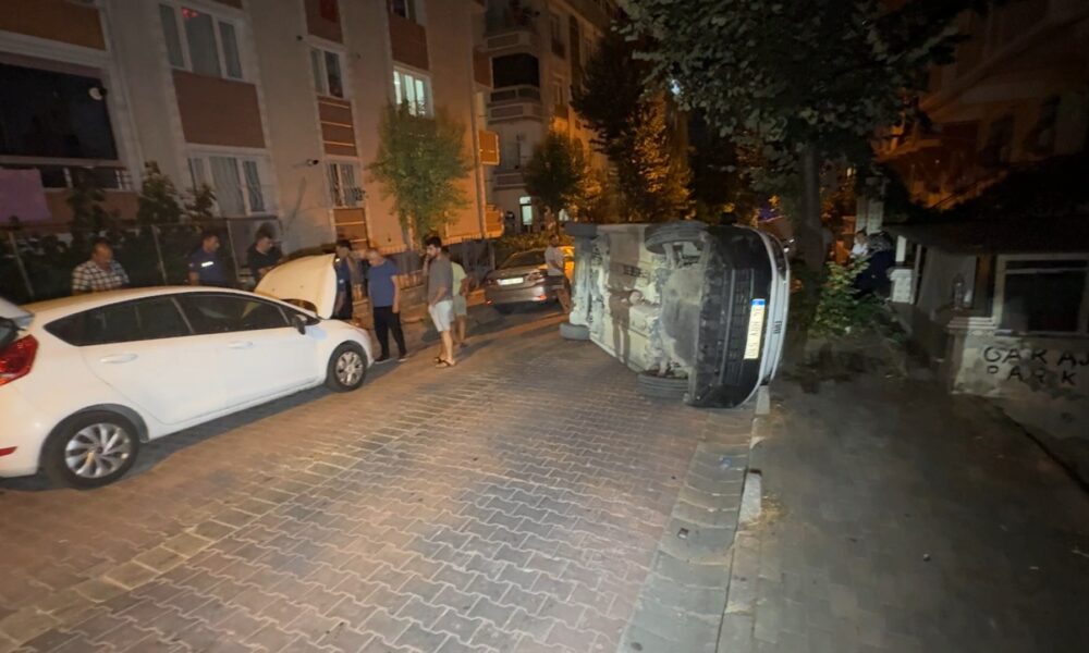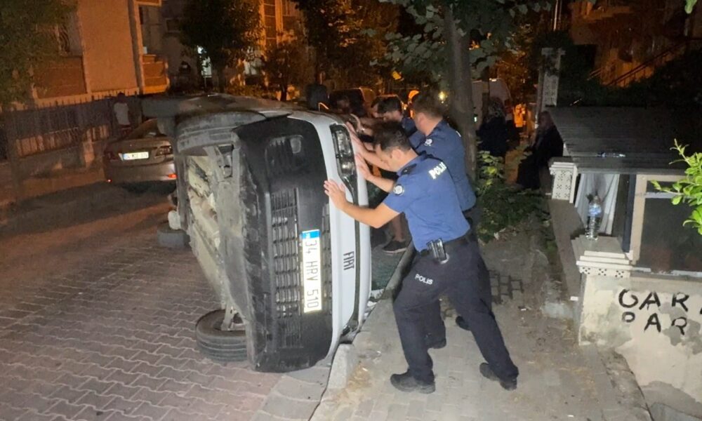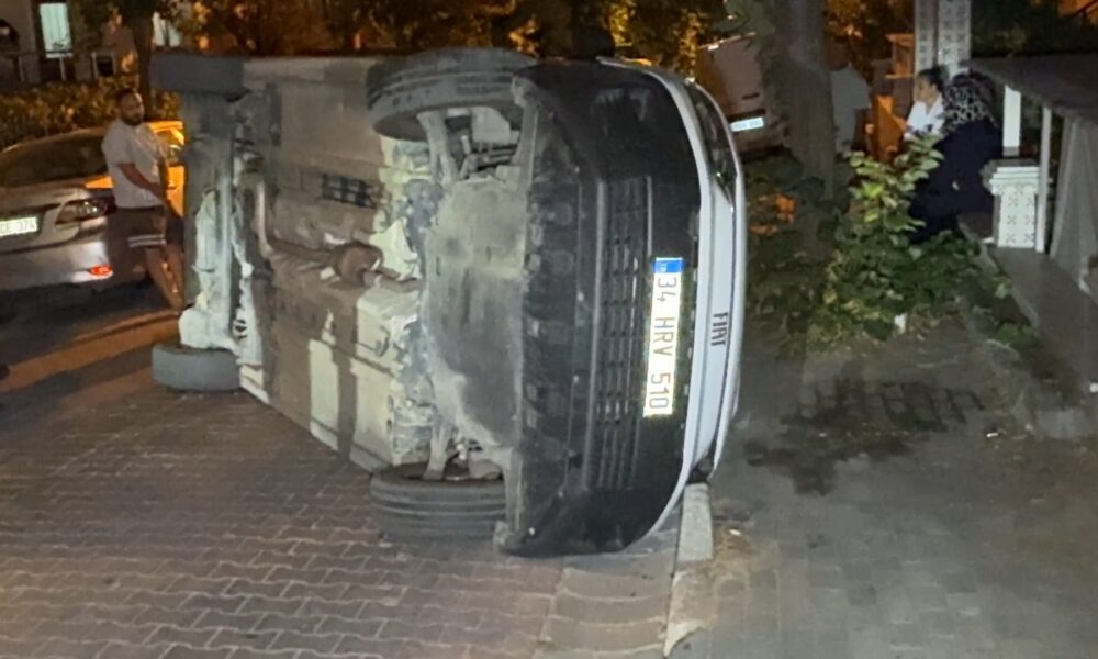 İstanbul – Avcılar’da park halindeki iki araca çarpan hafif ticari araç yan döndü