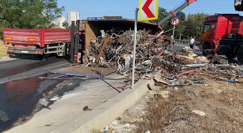 AVCILAR'da demir hurda taşıyan kamyonun şoförü virajı döneceği sırada direksiyon hâkimiyetini kaybederek kaza yaptı. Olay yerine gelen ekipler dökülen demir hurdaları toplarken kazada kamyon şoförü şans eseri yara almadan kurtuldu. Foto: İSTANBUL-DHA