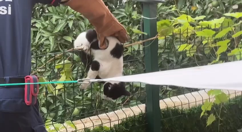 AVCILAR’da bir bahçeden diğerine geçmeye çalışan kedi tel çite sıkıştı. Bacağından yaralanan kedi itfaiye ekipleri tarafından kurtarıldı. ( FOTOĞRAF: İHSAN DÖRTKARDEŞ / İSTANBUL DHA ) FOTOĞRAFTA: BİNA SAKİNİ YUSUF ATMACA