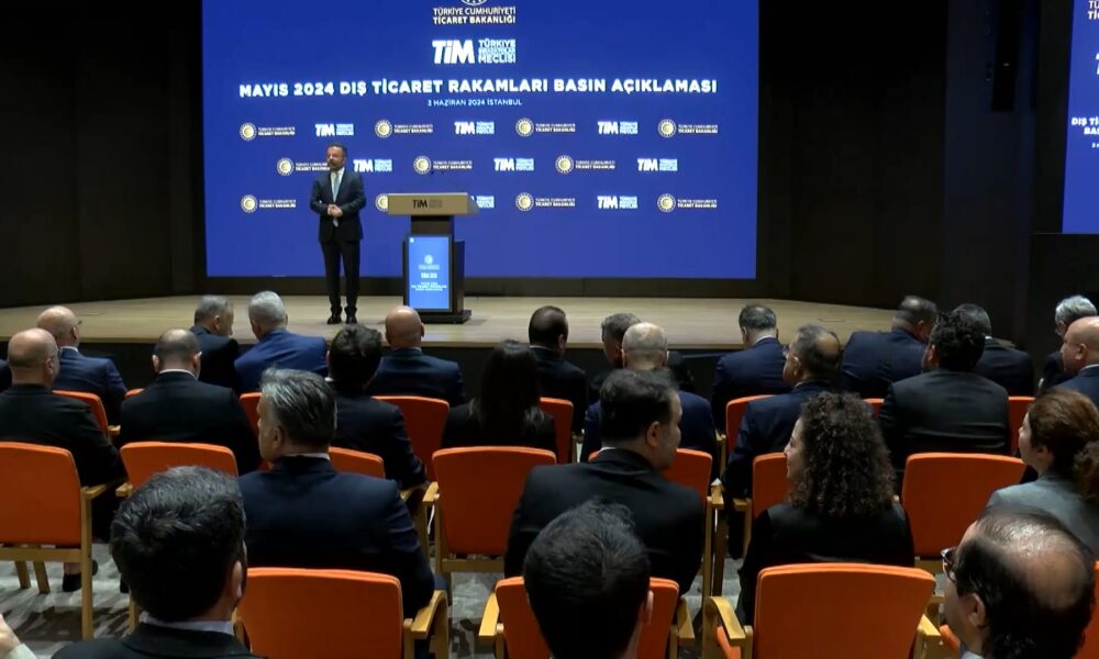 Ticaret Bakanı Prof. Dr. Ömer Bolat, Türkiye İhracatçılar Meclisi Dış Ticaret Kompleksi Şehit Ömer Halisdemir Konferans Salonu’nda 11.00’da düzenlenen 2024 Mayıs Ayı Dış Ticaret Rakamları Basın Açıklaması’nda konuştu. Fotoğraf: İstanbul(DHA) Fotoğraftaki: