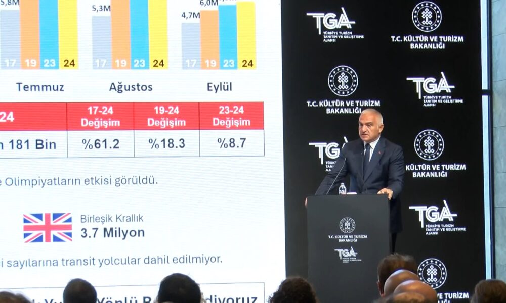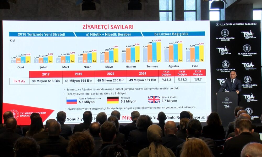 Kültür ve Turizm Bakanı Mehmet Nuri Ersoy “Gerçekleşen rakamlara baktığımızda 2017 yılında 30 milyon 518 bin ziyaretçi sayısıyla devralmışız. 2019 pandemi öncesi bu stratejiyle beraber çok hızlı bir çıkış yakalamışız ve 41 milyon 565 bin sayısına çıkmışız. 2023 yılında geçen sene ilk 9 ayda 45 milyon 230 bin sayısına ulaştık. Geçen seneki bu başarıyı 2024te 9 aylık verilerinde 49 milyon 181 bin olarak geldi. Yani çıkışımızı devam ettirdik. Yüzdesel karılaştırmaya baktığımız zaman 2017 ile 2024 yılını karşılaştırdığımızda yüzde 61.2’lik oranında ziyaretçi sayısında ciddi oranda artış görüyoruz.2019 ile 2024 ilk 9 aylık verileri kıyasladığımızda yüzde 18.3lük bir artış görüyoruz. Yani pandemi sonrasında Türkiye ziyaretçi sayısında yüzde 19.3lük bir artış gerçekleştirdi. 2023 – 2024 karşılaştırdığımızda ilk 9 ayda yüzde 8.7lik bir artış oldu ” dedi.