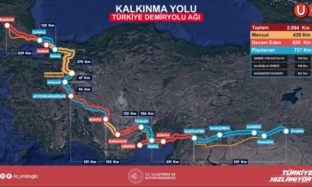Bakan Uraloğlu “Başka projemiz, Ankara İstanbul arasından hızlı trenden ayrılıp Osmanelinden Bursadan Bandırmaya kadar giden hattımız. Yaklaşık 200 kilometre civarında. Bunu da bu sene sonu itibariyle Bursaya kadar gayret ediyoruz. Biraz iddialı olmakla beraber. Geri kalanını da 2028e kadar bitirmiş olacağız. Bir başka projemiz Kalkınma Yolu Koridorunun da önemli bir parçasını oluşturan Mersin, Adana, Osmaniye, Gaziantep hattımız. Yaklaşık 312 kilometre uzunluğunda, bunu da inşallah 2026 sonu 2027 gibi bitirmiş olacağız. Bazı bölümlerinin dört hat olduğunu da özellikle belirtmek isterim.