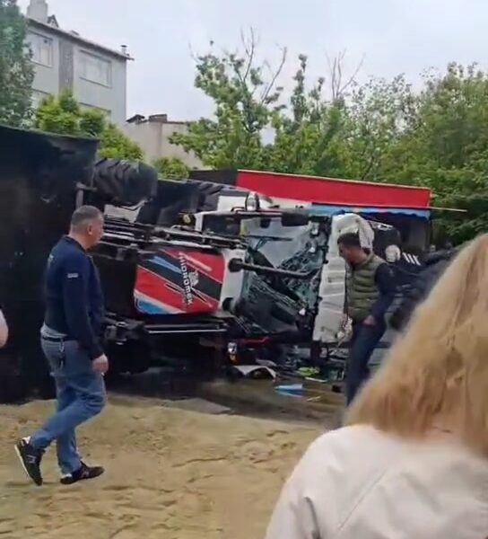 • Bayrampaşa'da iş makinesi araçlara çarpıp devrildi. (DHA)