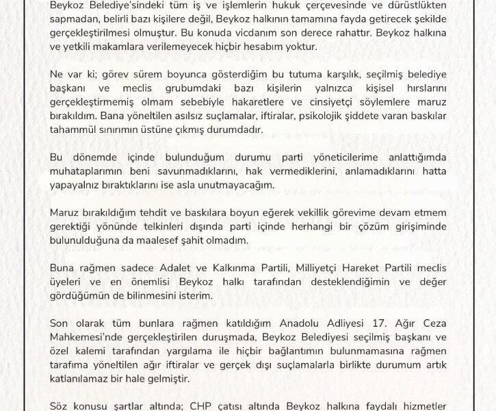 Gürzel açıklamasının devamında, “Son olarak tüm bunlara rağmen katıldığım Anadolu Adliyesi 17. Ağır Ceza Mahkemesi’nde gerçekleştirilen duruşmada, Beykoz Belediyesi seçilmiş başkanı ve özel kalemi tarafından yargılama ile hiçbir bağlantımın bulunmamasına rağmen tarafıma yöneltilen ağır iftiralar ve gerçek dışı suçlamalarla birlikte durum artık katlanılamaz bir hale gelmiştir. Söz konusu şartlar altında; CHP çatısı altında Beykoz halkına faydalı hizmetler gerçekleştiremeyeceğim için Cumhuriyet Halk Partisi’nden istifa ettiğimi kamuoyuna saygı ile duyuruyorum” ifadelerini kullandı.