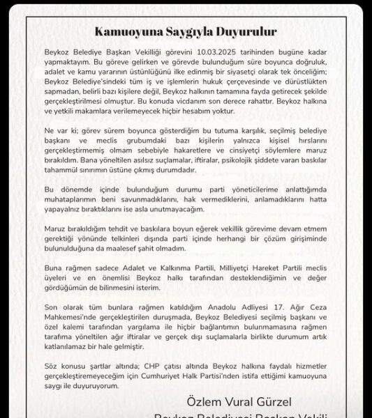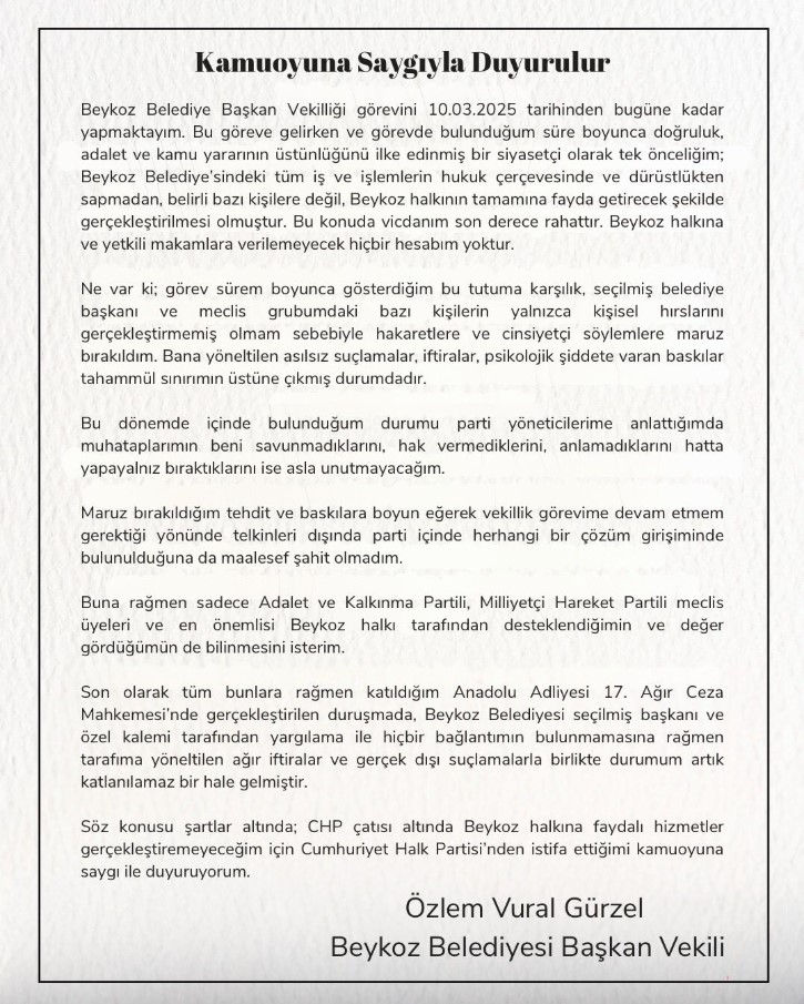 Beykoz Belediye Başkan Vekili Özlem Vural Gürzel, Cumhuriyet Halk Partisinden(CHP) istifa ettiğini açıkladı. İstifa kararını sosyal medya hesabından yaptığı yazılı açıklama ile duyuran Gürzel paylaşımında, “Kamuoyuna saygıyla duyurulur. Beykoz Belediye Başkan Vekilliği görevini 10.03.2025 tarihinden bugüne kadar yapmaktayım. Bu göreve gelirken ve görevde bulunduğum süre boyunca doğruluk, adalet ve kamu yararının üstünlüğünü ilke edinmiş bir siyasetçi olarak tek önceliğim; Beykoz Belediyesi’ndeki tüm iş ve işlemlerin hukuk çerçevesinde ve dürüstlükten sapmadan, belirli bazı kişilere değil, Beykoz halkının tamamına fayda getirecek şekilde gerçekleştirilmesi olmuştur. Bu konuda vicdanım son derece rahattır. Beykoz halkına ve yetkili makamlara verilemeyecek hiçbir hesabım yoktur. Ne var ki; görev sürem boyunca gösterdiğim bu tutuma karşılık, seçilmiş belediye başkanı ve meclis grubundaki bazı kişilerin yalnızca kişisel hırslarını gerçekleştirmemiş olmam sebebiyle hakaretlere ve cinsiyetçi söylemlere maruz bırakıldım. Bana yöneltilen asılsız suçlamalar, iftiralar, psikolojik şiddete varan baskılar tahammül sınırımın üstüne çıkmış durumdadır” ifadelerini kullandı.