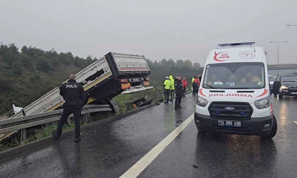 Kaza, Cumartesi günü saat 13.45 sıralarında Kuzey Marmara Otoyolu Ümraniye istikametinde meydana geldi. Edinilen bilgiye göre, O.Ö. idaresindeki TIR yolda ilerlediği sırada, şoför yağış nedeniyle kayganlaşan yolda direksiyon hakimiyetini kaybetti.Otoyolda ters dönen TIR, sağ şeride geçti. Bu sırada sağ şeritte ilerleyen otomobille karşı karşıya gelen TIR ardından şarampole yuvarlandı. Otomobil sürücüsü ise frene basarak ölümden kurtuldu. İhbar üzerine olay yerine polis, itfaiye ve sağlık ekipleri sevk edildi. Şarampole yuvarlanan TIR şoförü O.Ö., sağlık ekipleri tarafından olay yerinde yapılan ilk müdahalesinin ardından ambulansla hastaneye kaldırıldı.TIR şoförünün hayati tehlikesinin bulunmadığı öğrenilirken, kaza nedeniyle bölgede kısa süreli trafik yoğunluğu oluştu. TIRın bulunduğu yerden kaldırılması için çalışma başlatıldı.