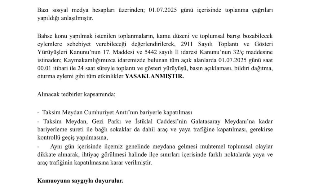 Bazı sosyal medya hesapları üzerinden bugün için toplanma çağrıları yapıldığı, yapılmak istenilen toplanmaların, kamu düzeni ve toplumsal barışı bozabilecek eylemlere sebebiyet verebileceğinin değerlendirildiğine yer verilen açıklamada, “2911 Sayılı Toplantı ve Gösteri Yürüyüşleri Kanununun 17. Maddesi ve 5442 sayılı İl idaresi Kanununun 32/ç maddesine istinaden; Kaymakamlığımızca idaremizde bulunan tüm açık alanlarda 1 Temmuz günü saat 00.01 itibarıyla 24 saat süreyle toplantı ve gösteri yürüyüşü, basın açıklaması, bildiri dağıtma, oturma eylemi gibi tüm etkinlikler yasaklanmıştır. Alınacak tedbirler kapsamında Taksim Meydanı Cumhuriyet Anıtının bariyerle kapatılmasına, Taksim Meydan, Gezi Parkı ve İstiklal Caddesinin Galatasaray Meydanına kadar bariyerleme suretiyle bağlı sokaklar da dahil araç ve yaya trafiğine kapatılmasına, gerekirse kontrollü geçiş yapılmasına, aynı gün içerisinde ilçemiz genelinde meydana gelmesi muhtemel toplumsal olaylar dikkate alınarak, ihtiyaç görülmesi halinde ilçe sınırları içerisinde farklı noktalarda yaya ve araç trafiğinin kapatılmasına karar verilmiştir” ifadeleri kullanıldı.