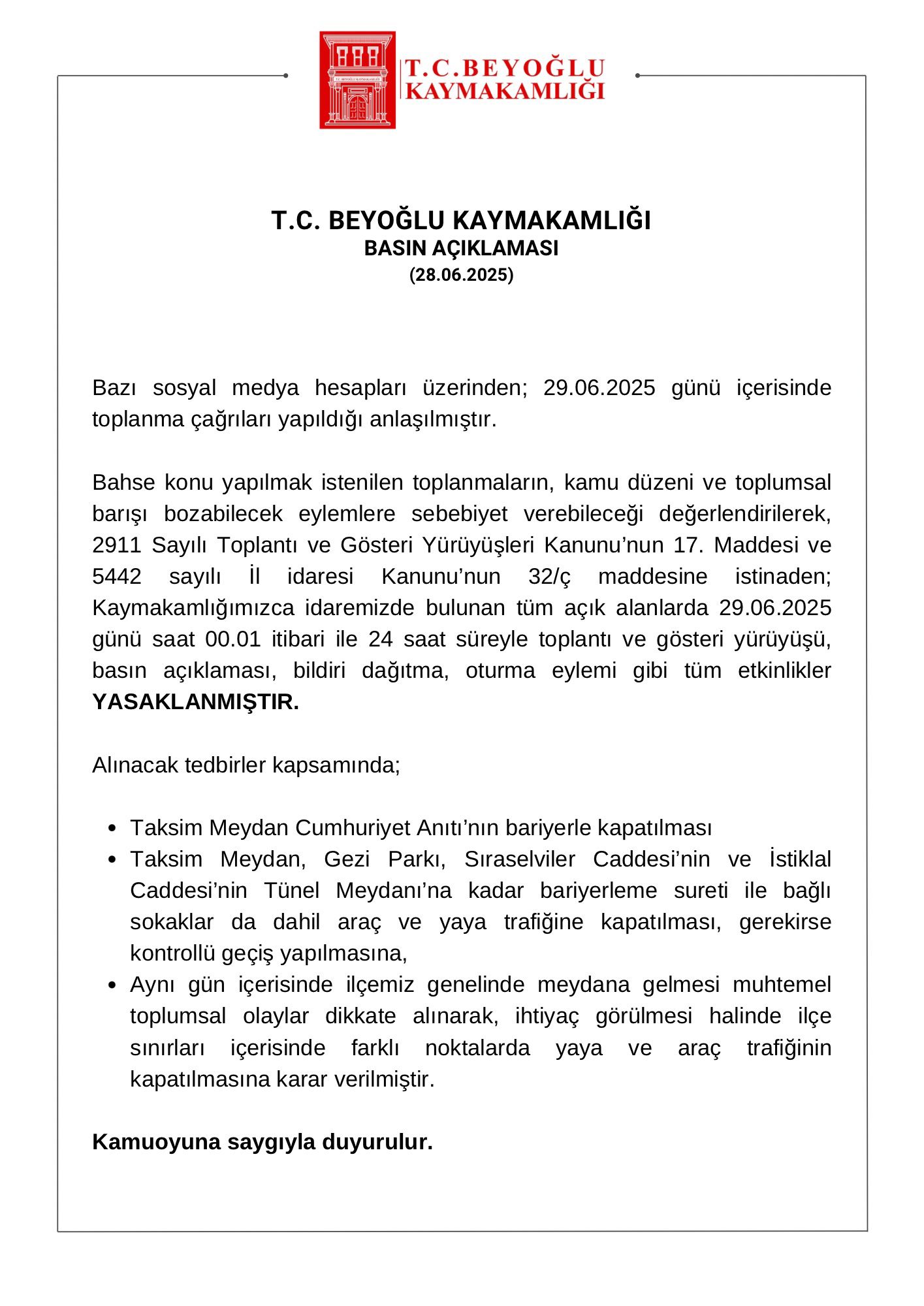 Beyoğlu Kaymakamlığı yaptığı açıklamada ilçe genelinde 1 gün süreyle gösteri, yürüyüş ve açık hava toplantılarının yasaklandığını duyurdu. Açıklamada, “Bazı sosyal medya hesapları üzerinden; 29.06.2025 günü içerisinde toplanma çağrıları yapıldığı anlaşılmıştır. Bahse konu yapılmak istenilen toplanmaların, kamu düzeni ve toplumsal barışı bozabilecek eylemlere sebebiyet verebileceği değerlendirilerek, 2911 Sayılı Toplantı ve Gösteri Yürüyüşleri Kanununun 17. Maddesi ve 5442 sayılı İl idaresi Kanununun 32/ç maddesine istinaden; Kaymakamlığımızca idaremizde bulunan tüm açık alanlarda 29.06.2025 günü saat 00.01 itibari ile 24 saat süreyle toplantı ve gösteri yürüyüşü, basın açıklaması, bildiri dağıtma, oturma eylemi gibi tüm etkinlikler yasaklanmıştır.