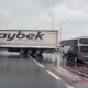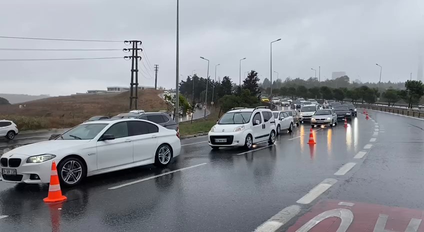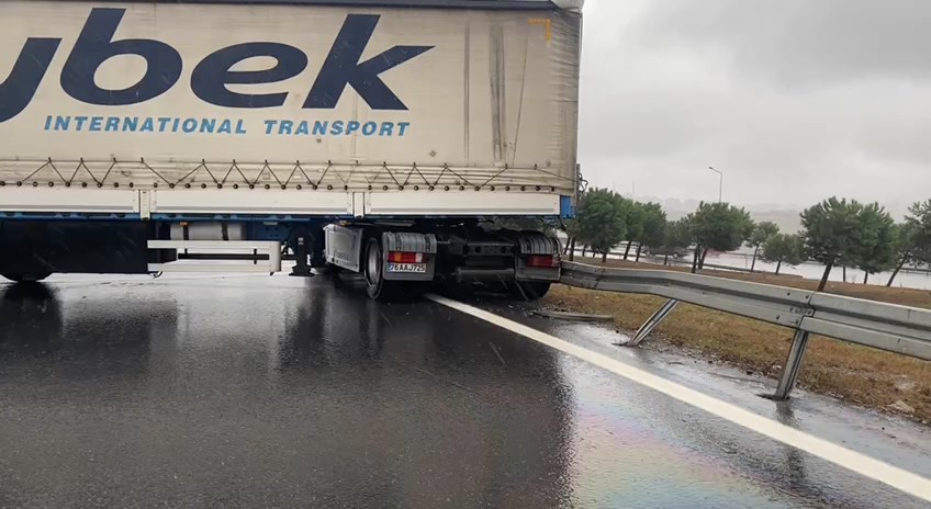 BÜYÜKÇEKMECE'de etkili olan sağanak yağış nedeniyle D-100 Karayolu Silivri istikametinde ilerleyen TIR, şoförünün direksiyon hakimiyetini kaybetmesi sonucu kaza yaptı.Bariyerlere çarparak savrulan TIR'ın dorsesi ters döndü. Kazada ölen ya da yaralanan olm