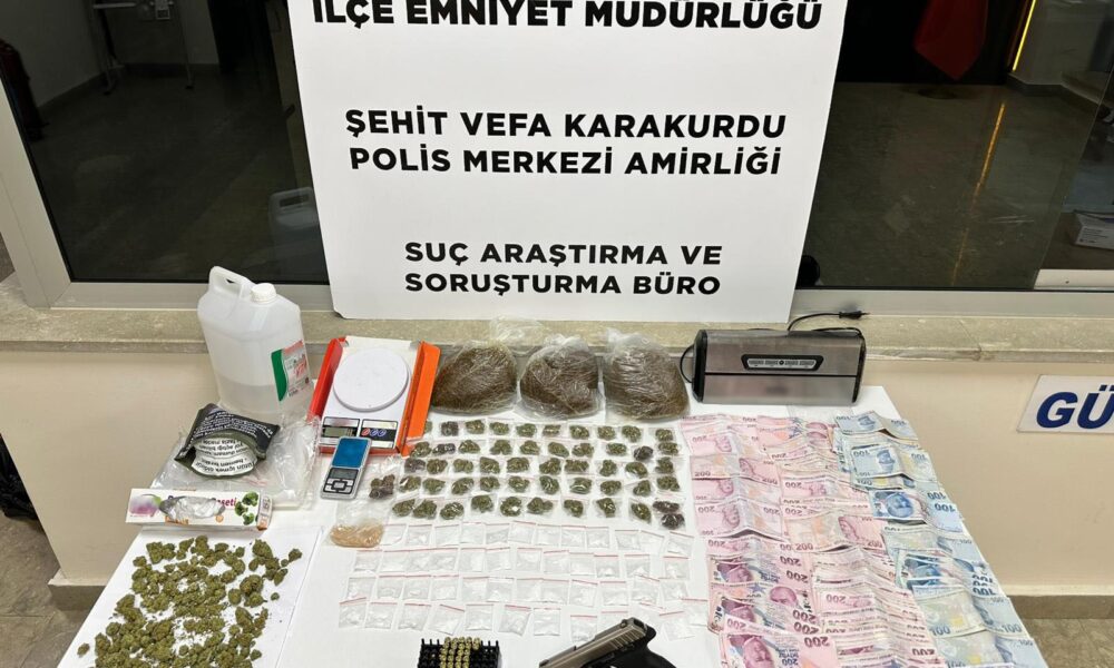 İstanbul Emniyet Müdürlüğüne bağlı polis ekipleri, Meclis Mahallesi’nde iş yerinde uyuşturucu madde satışı yapıldığı bilgisi üzerine operasyon düzenlendi. Ekipler Y.E.K. (20), D.K. (26) ve B.K. (22) isimli şüphelilerin binadan çıkarak kaçmaya çalıştığını belirledi. Dur ihtarına uymayan şüpheliler, kısa süren kovalamacanın ardından gözaltına alındı. Yapılan aramalarda 170,6 gram marihuana, 52,20 gram taş kokain, 23,56 gram sentetik kannabinoid hammaddesi, bin 562,7 gram sentetik kannabinoid emdirilmiş tütün, ruhsatsız tabanca ve 22 fişekle 27 bin 10 lira nakit para ele geçirildi.