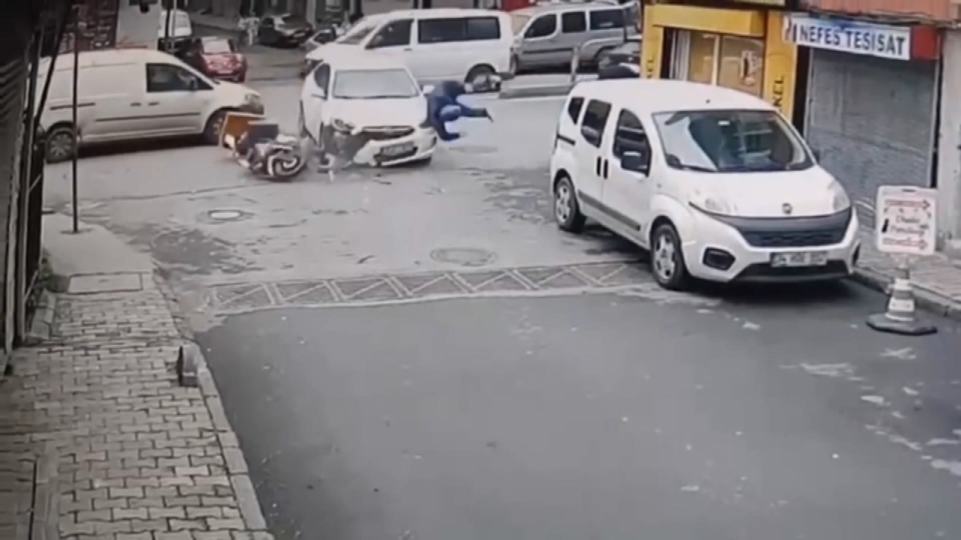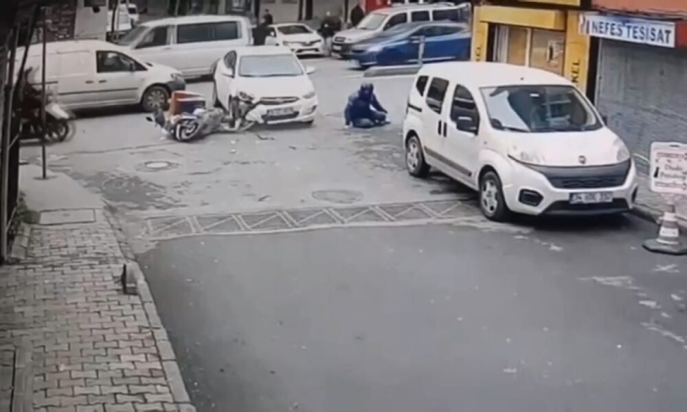 Cadde üzerinde hızla gelen motokurye, otomobile çarparak takla attı
