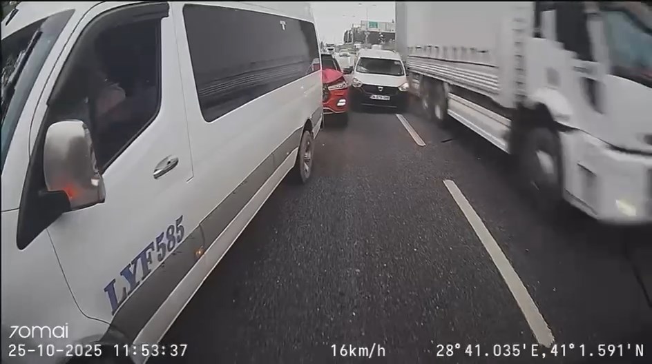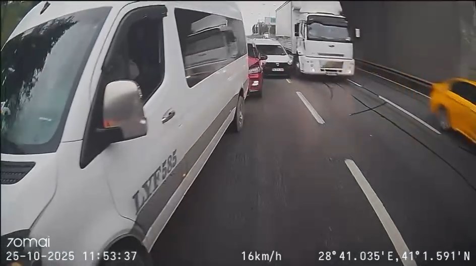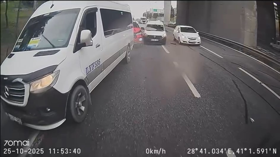 Kaza, dün saat 11.50 sıralarında Haramidere mevkiinde Avcılar istikametinde meydana geldi. Üç şeritli yolun sağ şeridinde ilerleyen otomobil bir anda yavaşladı. Arkasından gelen otomobilde yavaşlarken diğer araçlar duramayarak kaza yaptı. 4 aracın karıştığı zincirleme trafik kazasını görenler polis ve sağlık ekiplerine haber verdi. Kaza nedeniyle yolun 2 şeridi trafiğe kapandı. Araçlarda bulunan sürücü ve yolcular kazada yara aldı. Zincirleme kaza otomobildeki araç kameralarına yansıdı. Polis kazayla ilgili inceleme başlattı.