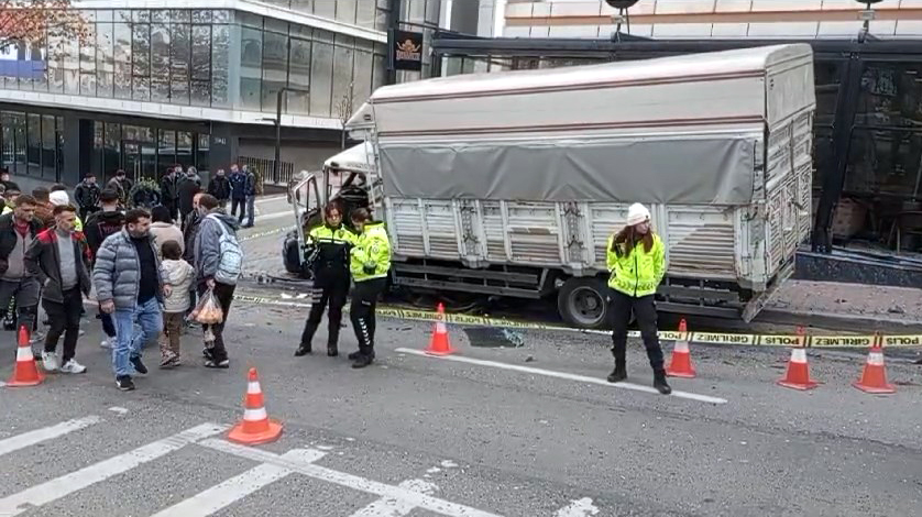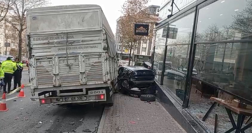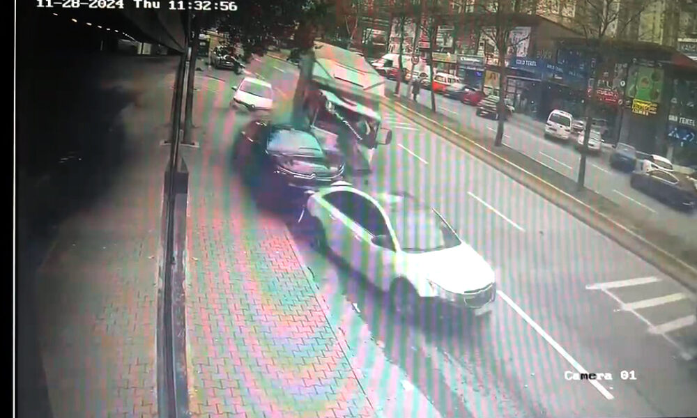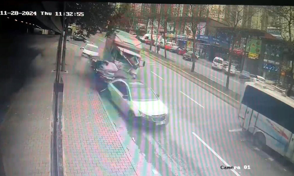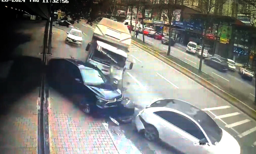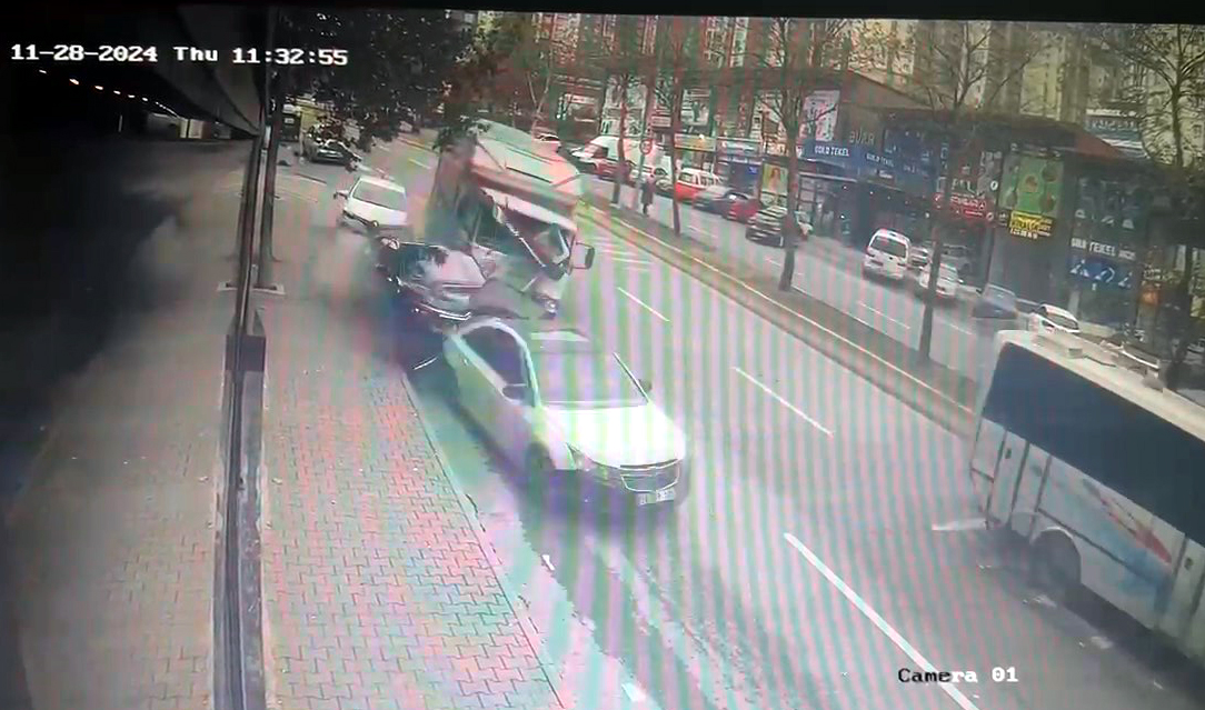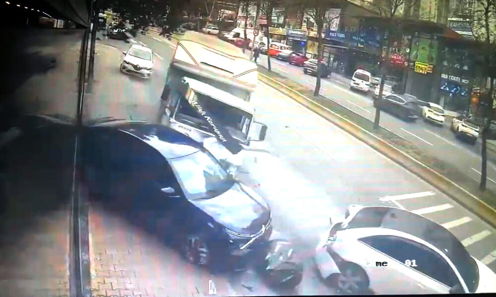 Kaza anı, bir işyerinin güvenlik kamerasına saniye saniye yansıdı. Güvenlik kamerasına yansıyan görüntülerde bir midibüsün arkasından caddede ilerleyen kamyonetin, park halinde bulunan araçlara çarptığı anlar görülüyor.