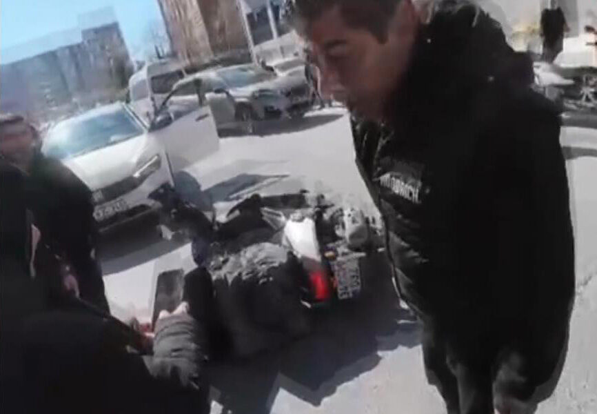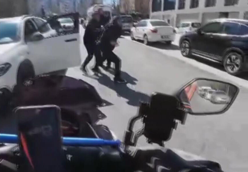 Sinirlenen otomobil sürücüsünü çevredekiler güçlükle durdurdu. Yanındaki kadına telefonu otomobilden getirmesini isteyen sürücü, “Şunun plakası al. Telefonu getir buraya.. Şu plakayı çek. Bana gel gel yapıyorsun değil mi? Ara Fatih ağabeyi. İşleme soksunlar bunu. Sen bana hareket mi yapıyorsun. Sen başını belaya soktun. Sen bilirsin. Bana gel gel yapıyorsun” dedi. Yaşanan kavga kask kamerasına yansıdı.