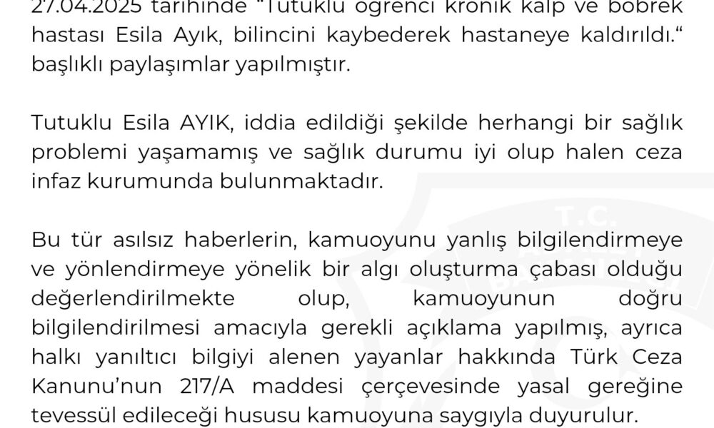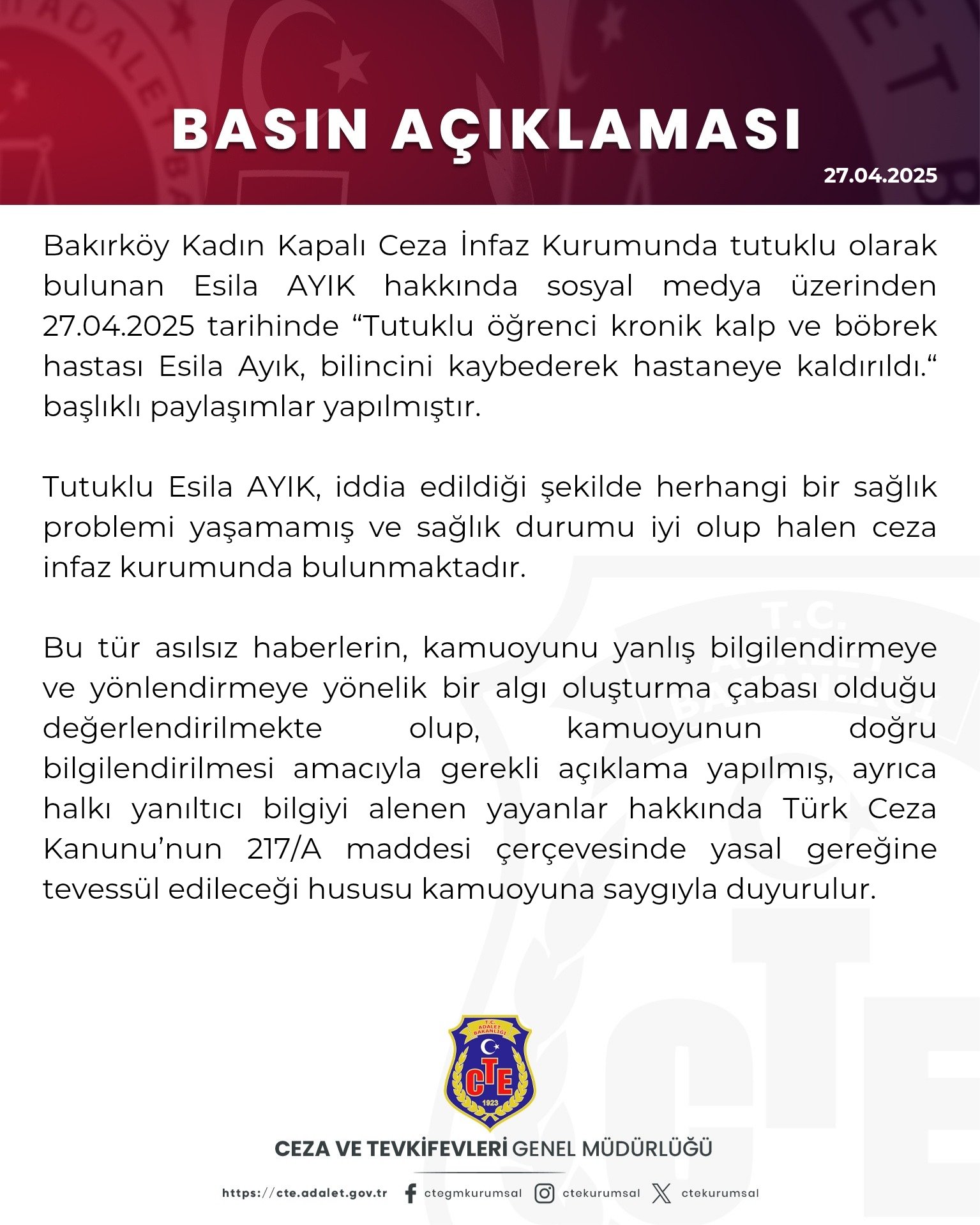 Bakırköy Kadın Kapalı Ceza İnfaz Kurumunda tutuklu bulunan Esila Ayık hakkında sosyal medyada yapılan bilincini kaybederek hastaneye kaldırıl paylaşımları üzerine Bakırköy Cumhuriyet Başsavcılığı tarafından inceleme başlatıldı. Yapılan araştırmada, paylaşımlarda yazılanların gerçek olmadığı ve yanıltıcı, yanlış bilgilerin yayıldığı belirlendi. Bakırköy Cumhuriyet Başsavcılığı tarafından olaya ilişkin yanıltıcı bilgiyi alenen yayma suçundan paylaşımları yapanlar hakkında resen soruşturma başlatıldı.