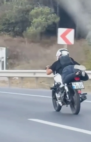 Olay, geçtiğimiz günlerde Kemerburgaz – Hasdal Yolu, İstanbul Havalimanı istikameti Mithatpaşa mevkiinde meydana geldi. Motosikletiyle seyir halindeki sürücü, trafikte akrobatik hareketler yaptı. Yüzüstü yatarak motosikletini kullanan sürücü, hem kendi canını hem de trafikteki diğer sürücüleri tehlikeye soktu. Bu anlar, arkasında seyir halinde olan otomobildeki bir yolcu tarafından cep telefonu kamerasıyla kaydedildi.