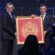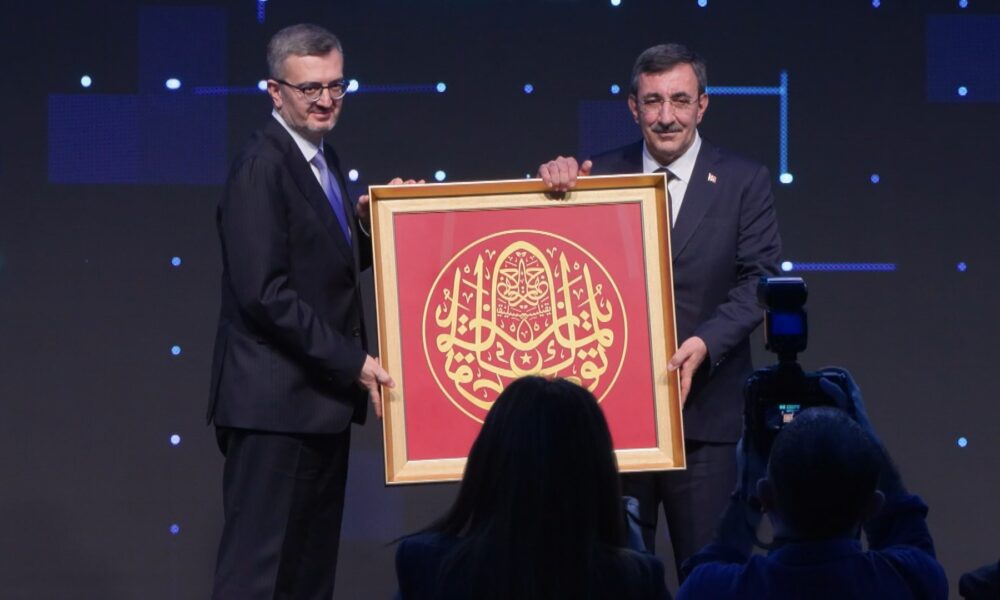 Konuşmalarının ardından İletişim Başkanı Burhanettin Duran, Cumhurbaşkanı Yardımcısı Cevdet Yılmaza hediye taktiminde bulundu.
