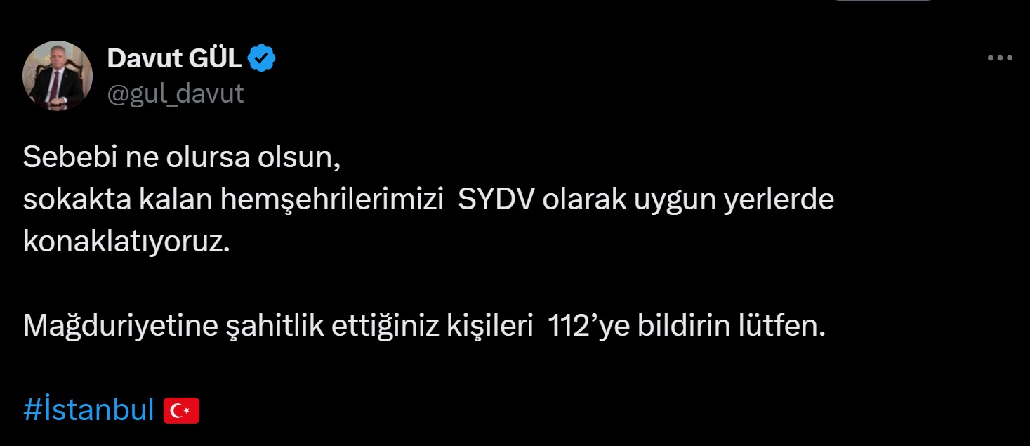 İstanbul Valisi Davut Gül, sosyal medya hesabından yaptığı paylaşımla sokakta kalmak zorunda olan İstanbulluların Sosyal Yardımlaşma ve Dayanışma Vakfı (SYDV) aracılığıyla uygun yerlerde konaklatıldığını belirterek mağdur olan kişileri görenlerin 112ye bildirilmesini istedi. Vali Gül paylaşımında, “Sebebi ne olursa olsun, sokakta kalan hemşerilerimizi SYDV olarak uygun yerlerde konaklatıyoruz. Mağduriyetine şahitlik ettiğiniz kişileri 112’ye bildirin lütfen” ifadelerine yer verdi.