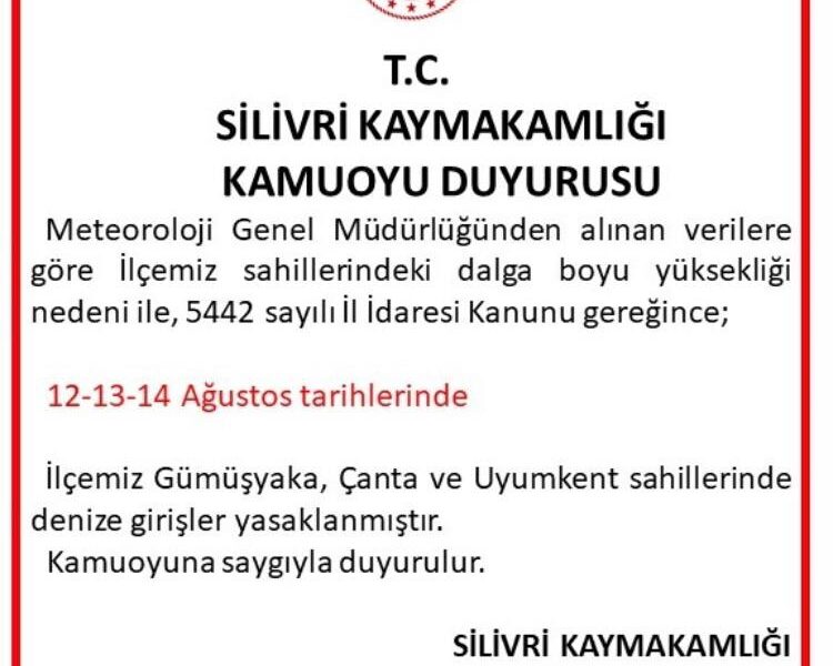 Meteoroloji Genel Müdürlüğünün uyarıları sonrasında Silivri, Arnavutköy ve Şile Kaymakamlıkları tarafından yapılan açıklamalarda, kuvvetli rüzgar ve dalga nedeniyle bu ilçelerde denize girmenin yasaklandığı duyuruldu.