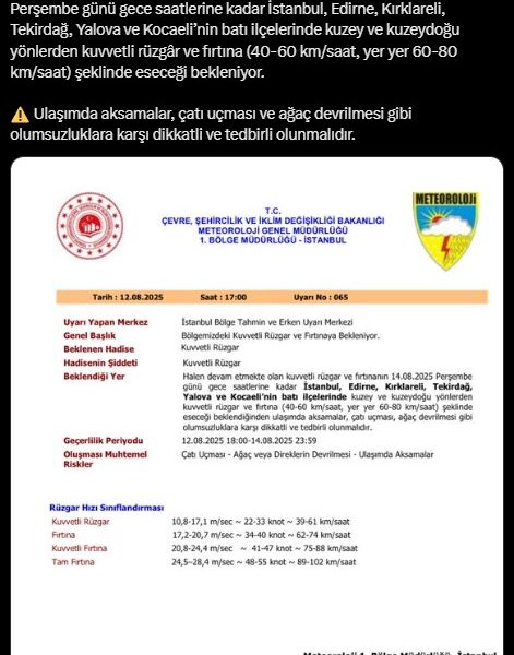 Meteoroloji Genel Müdürlüğü, İstanbul ve çevre iller için kuvvetli rüzgâr ve fırtına uyarısında bulundu. Konuyla ilgili İstanbul Valiliğinden yapılan açıklamada, “Bölgemizde kuvvetli rüzgâr ve fırtına bekleniyor. Meteoroloji Genel Müdürlüğü’ne göre; halen devam etmekte olan kuvvetli rüzgâr ve fırtınanın 14.08.2025 Perşembe günü gece saatlerine kadar İstanbul, Edirne, Kırklareli, Tekirdağ, Yalova ve Kocaeli’nin batı ilçelerinde kuzey ve kuzeydoğu yönlerden kuvvetli rüzgâr ve fırtına (40-60 km/saat, yer yer 60-80 km/saat) şeklinde eseceği bekleniyor. Ulaşımda aksamalar, çatı uçması ve ağaç devrilmesi gibi olumsuzluklara karşı dikkatli ve tedbirli olunmalıdır” ifadeleri yer aldı.