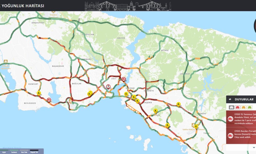 İstanbul’da akşam saatlerinde trafik yoğunluğu arttı. İstanbul Büyükşehir Belediyesi trafik yoğunluğu haritası verilerine göre saat 17.50 itibariyle yoğunluk 85 olarak ölçüldü. Ana arterlerde araçlar güçlükle ilerlerken, D-100 Karayolu Yenibosna Mevkiinde uzun araç kuyrukları oluştu.