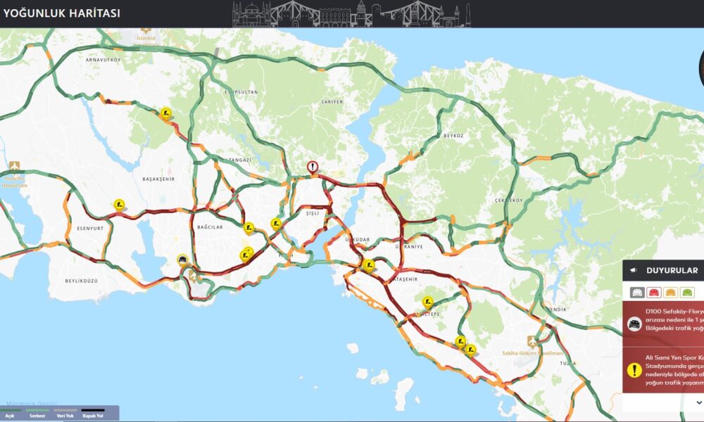 İstanbulda akşam saatlerinde trafik yoğunluğu oluştu. İstanbul Büyükşehir Belediyesi Trafik Yoğunluğu Haritası verilerine göre saat 18.22 itibariyle yoğunluk yüzde 89a ulaştı. Kentteki ana arterlerde trafik durma noktasına geldi. D-100 Karayolu Yenibosna Mevkiinde araçların güçlükle ilerlediği görüldü.