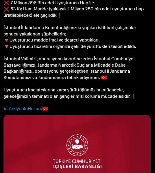 İstanbul İl Jandarma Komutanlığının istihbarat çalışmaları sonucunda, uyuşturucu imal eden ve satan kişilere yönelik operasyon düzenlendi. Operasyonda 7 milyon 896 bin adet satışa hazır uyuşturucu hap ve yaklaşık 1 milyon 280 bin adet uyuşturucu hap yapımında kullanılabilecek olan 63 kilogram ağırlığında uyuşturucu ham maddesi ele geçirildi. Yakalanan şüpheliler, Organize şekilde uyuşturucu madde imal ve ticareti yapmak suçundan gözaltına alındı. Operasyon, İçişleri Bakanı Ali Yerlikaya tarafından sosyal medya hesabından duyuruldu. Bakan Yerlikaya paylaşımında, “İstanbul’da 2. Operasyon İstanbul’da “Uyuşturucu Madde İmalatçısı Zehir Tacirlerineö yönelik Jandarmamız tarafından düzenlenen operasyonumuzda; 7 Milyon 896 Bin adet Uyuşturucu Hap ile 63 Kg Ham Madde (yaklaşık 1 Milyon 280 bin adet uyuşturucu hap üretilebilecek) ele geçirdik. İstanbul İl Jandarma Komutanlığımızca yapılan istihbari çalışmalar sonucu yakalanan şüphelilerin uyuşturucu madde imal ve ticareti yaptıkları, uyuşturucu ticaretini organize şekilde yürüttükleri tespit edildi. İstanbul Valimizi, operasyonu koordine eden İstanbul Cumhuriyet Başsavcılığımızı, Jandarma Narkotik Suçlarla Mücadele Daire Başkanlığımızı, operasyonu gerçekleştiren İstanbul İl Jandarma Komutanımızı ve Jandarmamızı tebrik ediyorum. Uyuşturucu imalatçılarına karşı yürüttüğümüz bu mücadele, geleceğimizin teminatı olan gençlerimizi koruma mücadelesidir” ifadelerini kullandı.
