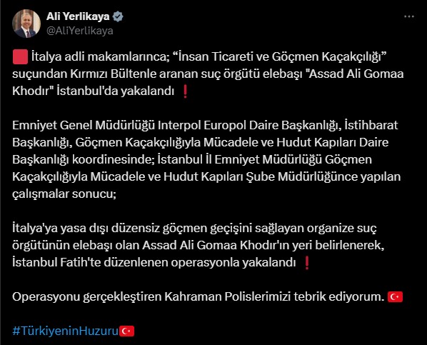 İçişleri Bakanı Ali Yerlikaya, konuya ilişkin sosyal medya hesabından açıklama yaptı. Yerlikaya paylaşımında, “İtalya adli makamlarınca; “İnsan Ticareti ve Göçmen Kaçakçılığıö suçundan Kırmızı Bültenle aranan suç örgütü elebaşı “Assad Ali Gomaa Khodır” İstanbulda yakalandı. Emniyet Genel Müdürlüğü Interpol Europol Daire Başkanlığı, İstihbarat Başkanlığı, Göçmen Kaçakçılığıyla Mücadele ve Hudut Kapıları Daire Başkanlığı koordinesinde; İstanbul İl Emniyet Müdürlüğü Göçmen Kaçakçılığıyla Mücadele ve Hudut Kapıları Şube Müdürlüğünce yapılan çalışmalar sonucu; İtalyaya yasa dışı düzensiz göçmen geçişini sağlayan organize suç örgütünün elebaşı olan Assad Ali Gomaa Khodırın yeri belirlenerek, İstanbul Fatihte düzenlenen operasyonla yakalandı. Operasyonu gerçekleştiren Kahraman Polislerimizi tebrik ediyorum.” ifadelerine yer verdi.