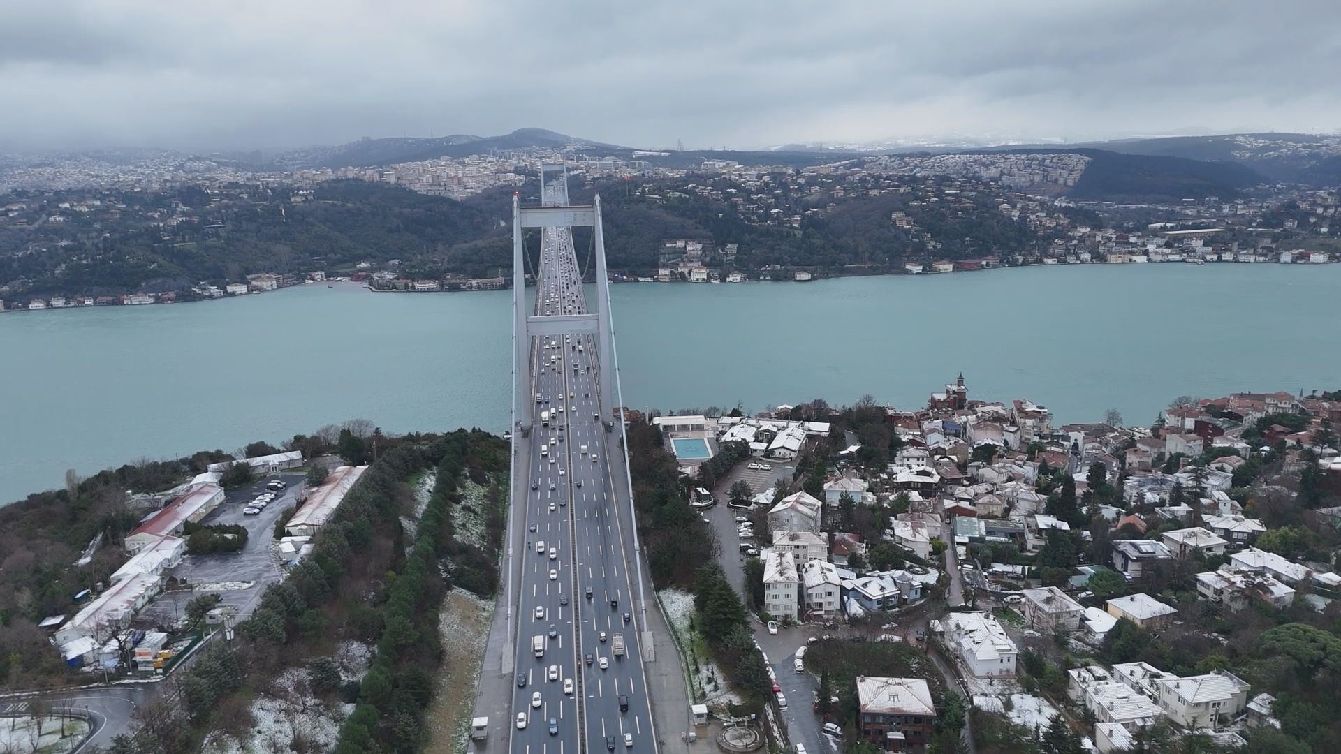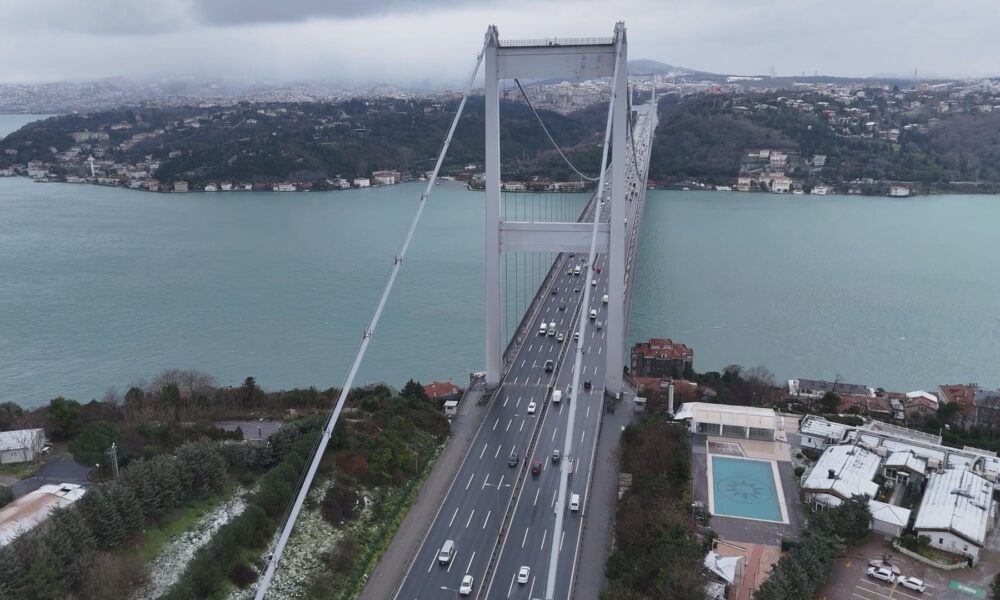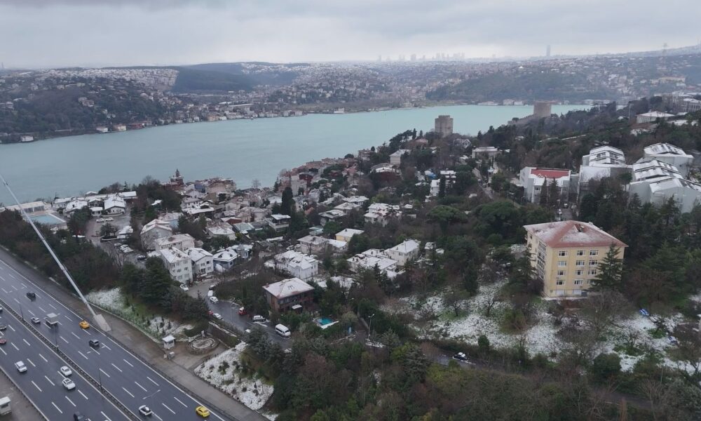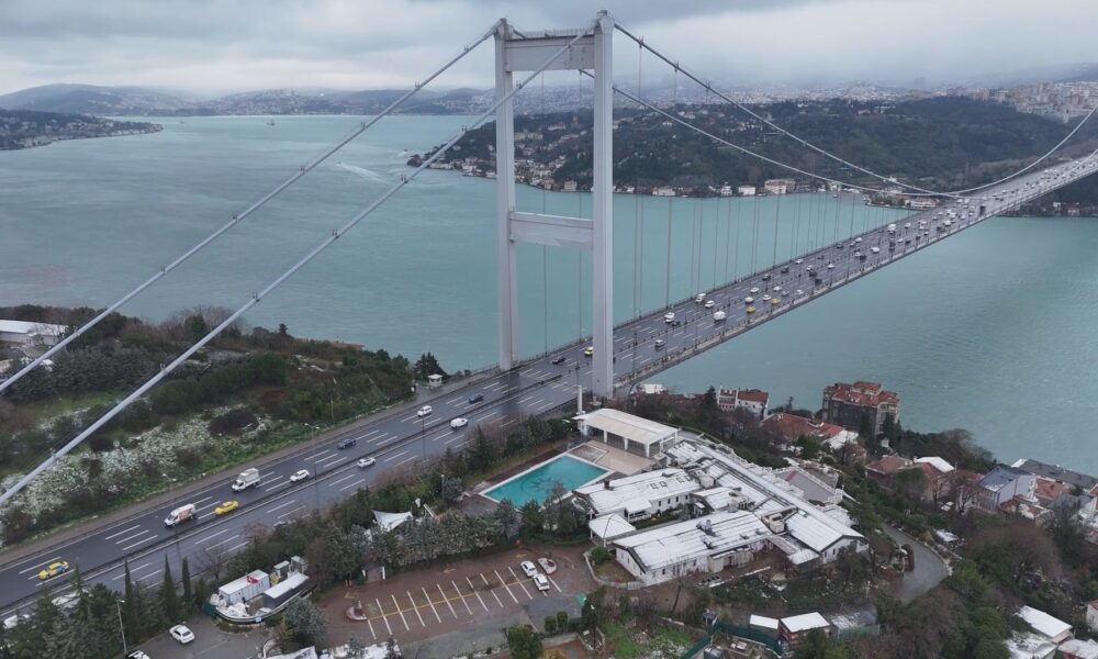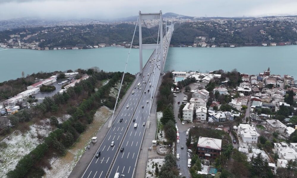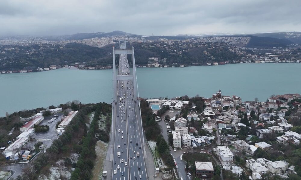 Meteoroloji Genel Müdürlüğü ve AKOMun uyarılarının ardından İstanbulda kar yağışı aralıklarla etkili olmaya devam ediyor. Kent genelinde etkili olan yağış nedeniyle birçok ilçe beyaza büründü. Kar yağışının ardından Fatih Sultan Mehmet Köprüsü ve çevresi dronla havadan görüntülendi.