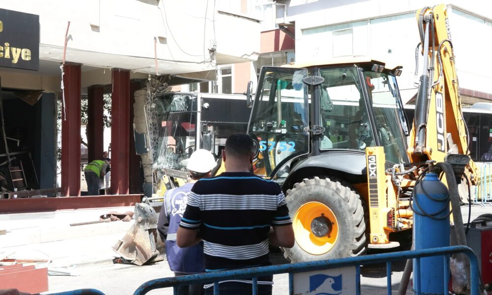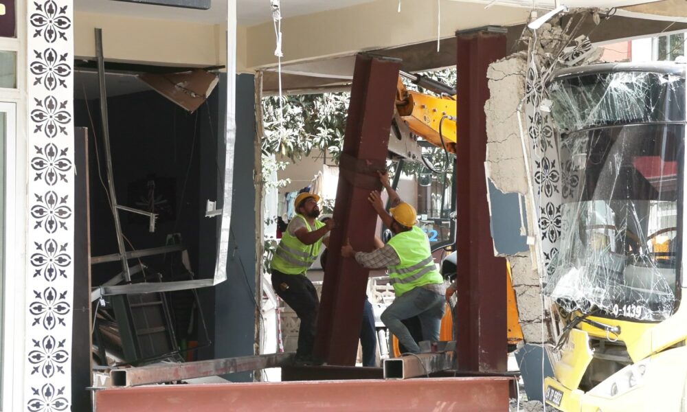 Pendik’te İETT otobüsünün çarptığı 4 katlı binanın kolonları otobüsün çekilmesi için güçlendirildi-1