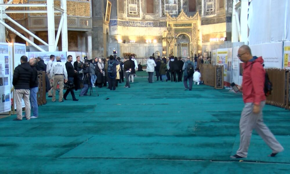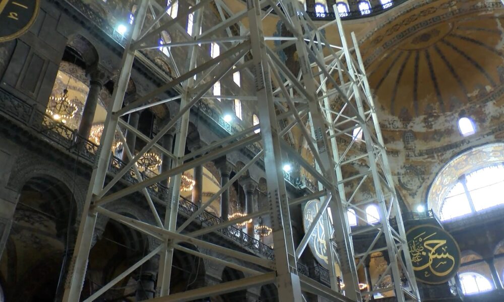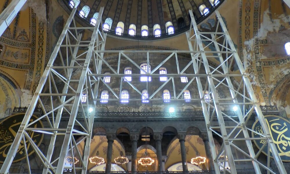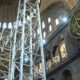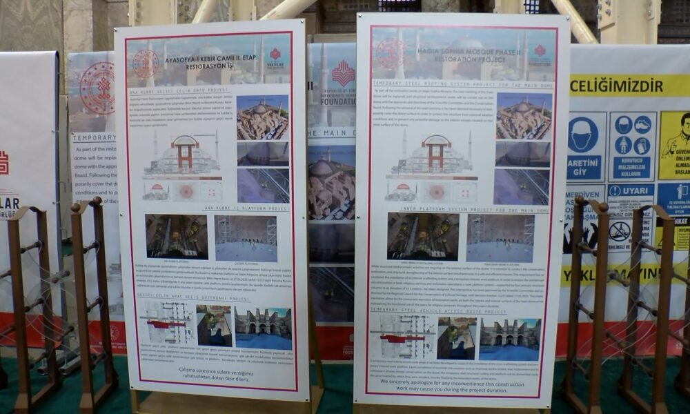 Konuşmasına şöyle devam eden Güleç, “Tabii bu ayakları ve yukarıya gelecek diğer taşıyıcı sistemleri kurmak üzere mecburen yaptığımız bir uygulama. Çok uzun sürmeyecek. Arkadaşlarımız bu yılbaşına kadar buranın platformunu kurmuş olacak. Belki dış üst örtüyü de kuracak yani bu ayaklar aslında bakanımızın Nisan ayında açıkladığı röportajda verdiği üst örtüyü geçici korumak üzere kurulacak olan örtünün ayakları aynı zamanda yaza doğru yani Nisan, Mayıs aylarında. Nisan ayında çalışmaya başlayacağımızı düşünüyoruz. Kubbenin kurşun örtüsü açıldığında onun dış iklimlerden korunmasını sağlayacak örtücü. Bu elzem bir durum haline geldiğinden uygulamaları yapmak zorunda kaldık. Bu güçlendirme çalışmasında herhangi bir şekilde yapının zarar görmemesi için. Çünkü biliyorsunuz bizim yağışlarımız genelde yaz yağışları çok şiddetli oluyor bugün de gördüğünüz gibi şiddetli bir yağış oldu. Böyle bir durumda eğer bizim kubbemiz dışarıdan ıslanırsa onu telafi etmek çok zor olacak. Ona engel olmak için geçici bir örtü oluşturuluyor. Böylece kurşunlar söküldüğünde ve daha önce de bahsetmiştik. Sizler ile yaptığımızı röportajlarda kubbenin üst kısmında birçok moloz döküntü vesaire şeyler oradan indirmek yerine oralarda kullanılmış. Böylece kubbenin dış kısmı ağır bir yük halinde onların temizlenmesi için oranın daha sağlıklı hale getirilmesi daha sonra da beklenen depreme karşı güçlendirilmesi için yapılacak uygulamalarda bu kubbemiz koruyacak olan bir iskele ve üst örtü sistemi. Evet bilgimiz dahilinde bugün vinçlerin girmesi burada gördüğünüz gibi panolarımız var panolarda da buna benzer şeyler tabii bu kadar detaylı olmamak üzere belirtiliyor. İçerideki iskelenin ne amaçla kuruluyor nasıl kuruluyor bununla ilgili bilgiler var belki arkadaşlarımız artık bu vinçlerle ilgili de bir plan hazırlarlar. Onu da yapabilirler böylece daha bilgilendirici olur. Aslında burada bizdeki hata bu bilgileri basına eksik bildirmiş olmamız ya da kamuoyuna eksik bildirmiş olmamız. Oradan kaynaklanıyor ama bu gene de arkadaşlarımız bu panoları bir okusaydı ve ondan sonra bu tür yayınlar yapılsaydı daha iyi olurdu. Çünkü bir de bunun söküm zamanı var. Burun bir şeyi de iç kısımda da dışarıda uygulama yaparken iç kısımdaki mozaiklerin korunması mozaikler de olabilecek herhangi bir şey anında müdahale etmek için içeride de bir yürüyüş platformu oluşturulacak. Burada gördüğünüz şu ayakta bir asansör oluşturulacak yukarı çıkıp inmeler için. Bunların olması diğer dış kubbe dışında yapacağımız uygulamalar için muhakkak gerekli olan uygulamalar. O yüzden de bunu yapıyoruz” şeklinde konuştu.