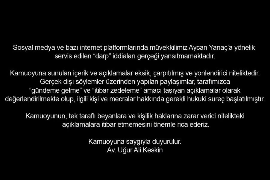 Sosyal medya hesabı üzerinden avukatı aracılığıyla açıklama yapan Aycan Yanaç ise, “Sosyal medya ve bazı internet platformlarında müvekkilimiz Aycan Yanaça yönelik servis edilen Darp iddiaları gerçeği yansıtmamaktadır. Kamuoyuna sunulan içerik ve açıklamalar eksik, çarpıtılmış ve yönlendirici niteliktedir. Gerçek dışı söylemler üzerinden yapılan paylaşımlar, tarafımızca Gündeme gelme ve İtibar zedeleme amacı taşıyan açıklamalar olarak değerlendirilmekte olup, ilgili kişi ve mecralar hakkında gerekli hukuki süreç başlatılmıştır. Kamuoyunun tek taraflı beyanlara ve kişilik haklarına zarar verici nitelikteki açıklamalara itibar etmemesini önemle rica ederiz. Kamuoyuna saygıyla duyurulur” ifadelerini kullandı.++++